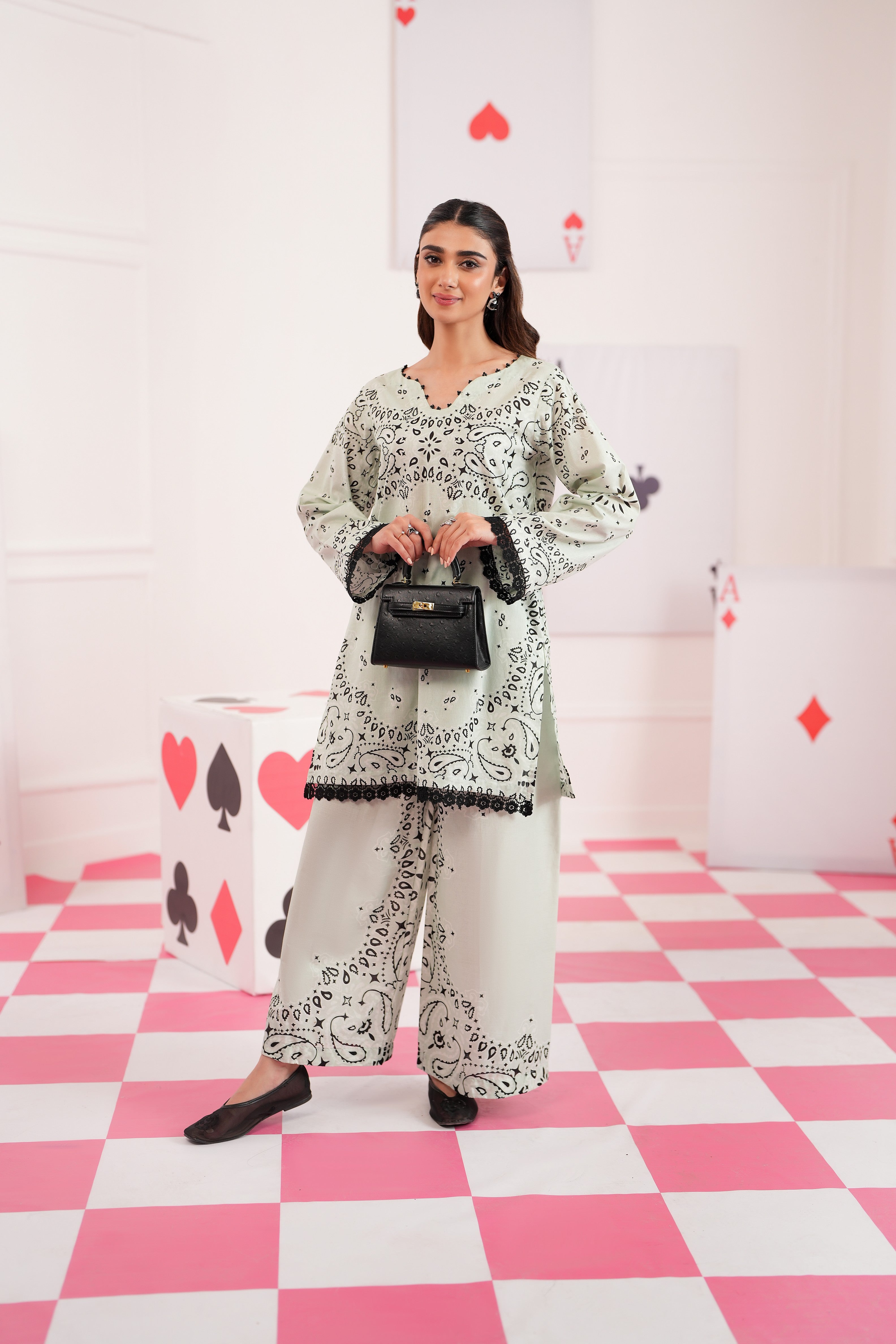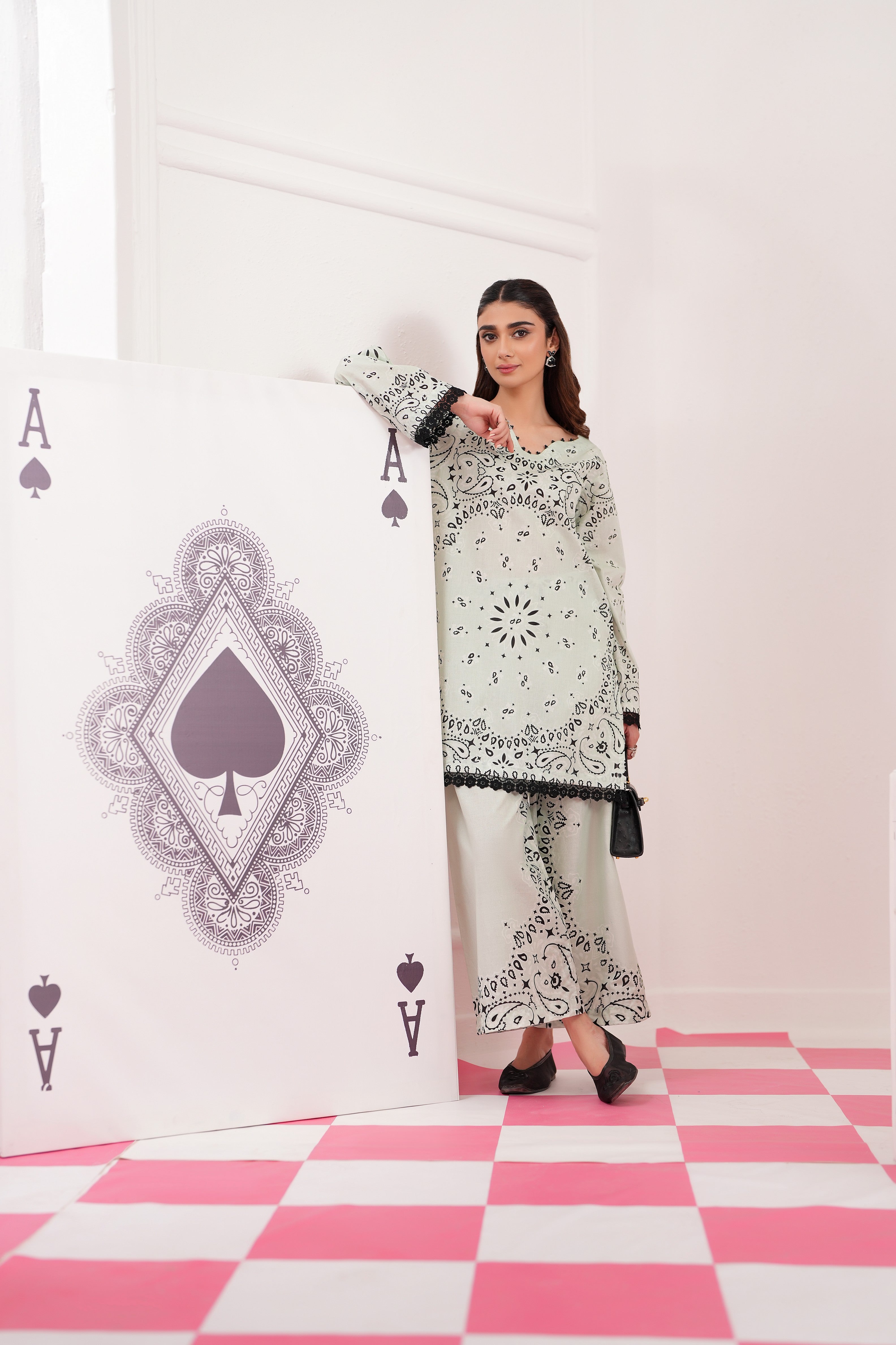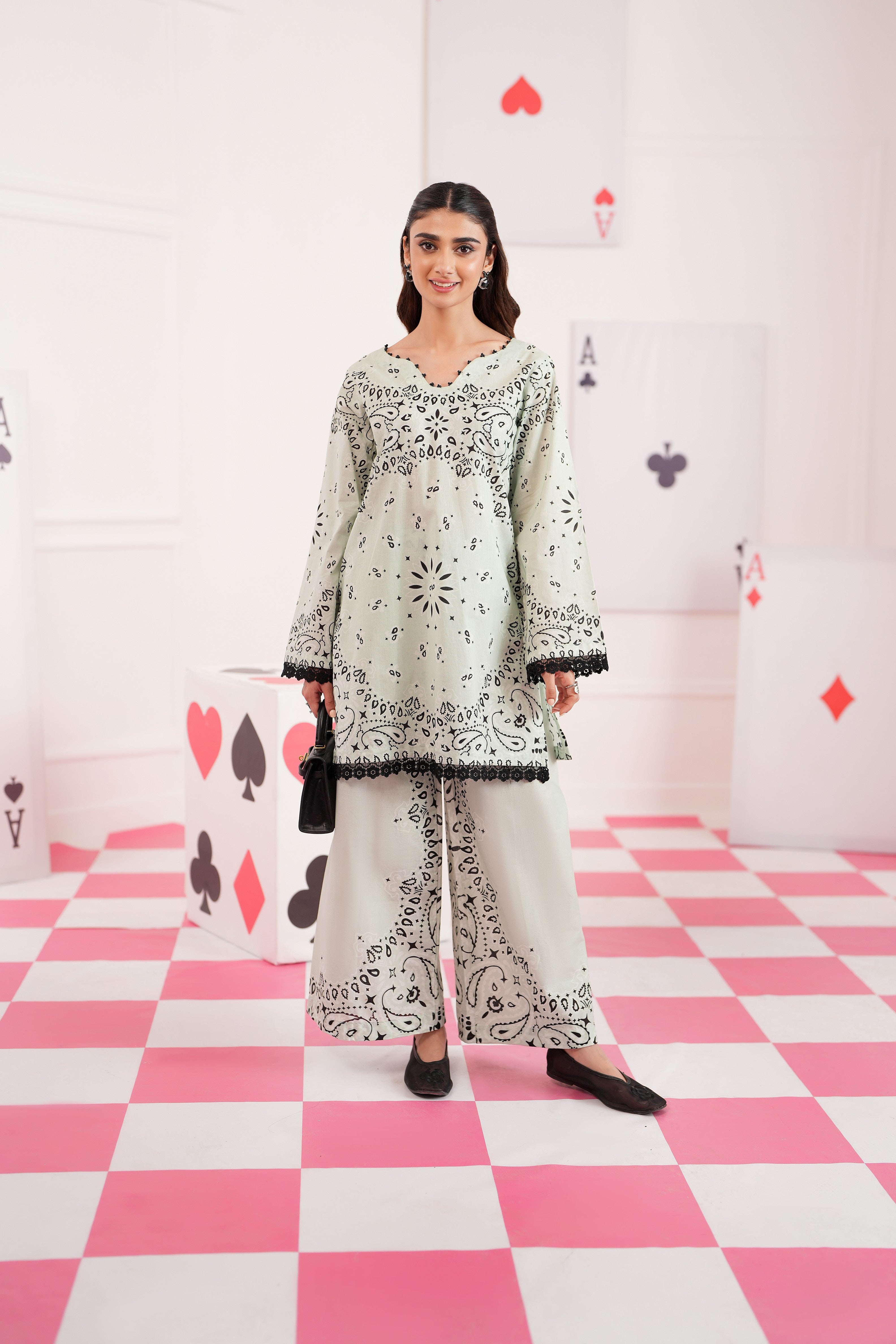 Summary: Embrace effortless elegance with the Regalia Cocoon Basic Pret Co-Ord set. This stunning Pakistani suit features a shirt and trouser in a serene Sea Green hue. Crafted from premium lawn fabric, this outfit is lightweight and breathable, making it an ideal choice for the Spring/Summer season. The kameez is adorned with a distinctive black print and finished with delicate lace trim on the sleeves and hemline, adding a touch of sophistication. As a versatile piece of ethnic wear, this co-ord set is perfect for daily wear and casual outings, offering a blend of comfort and contemporary style.