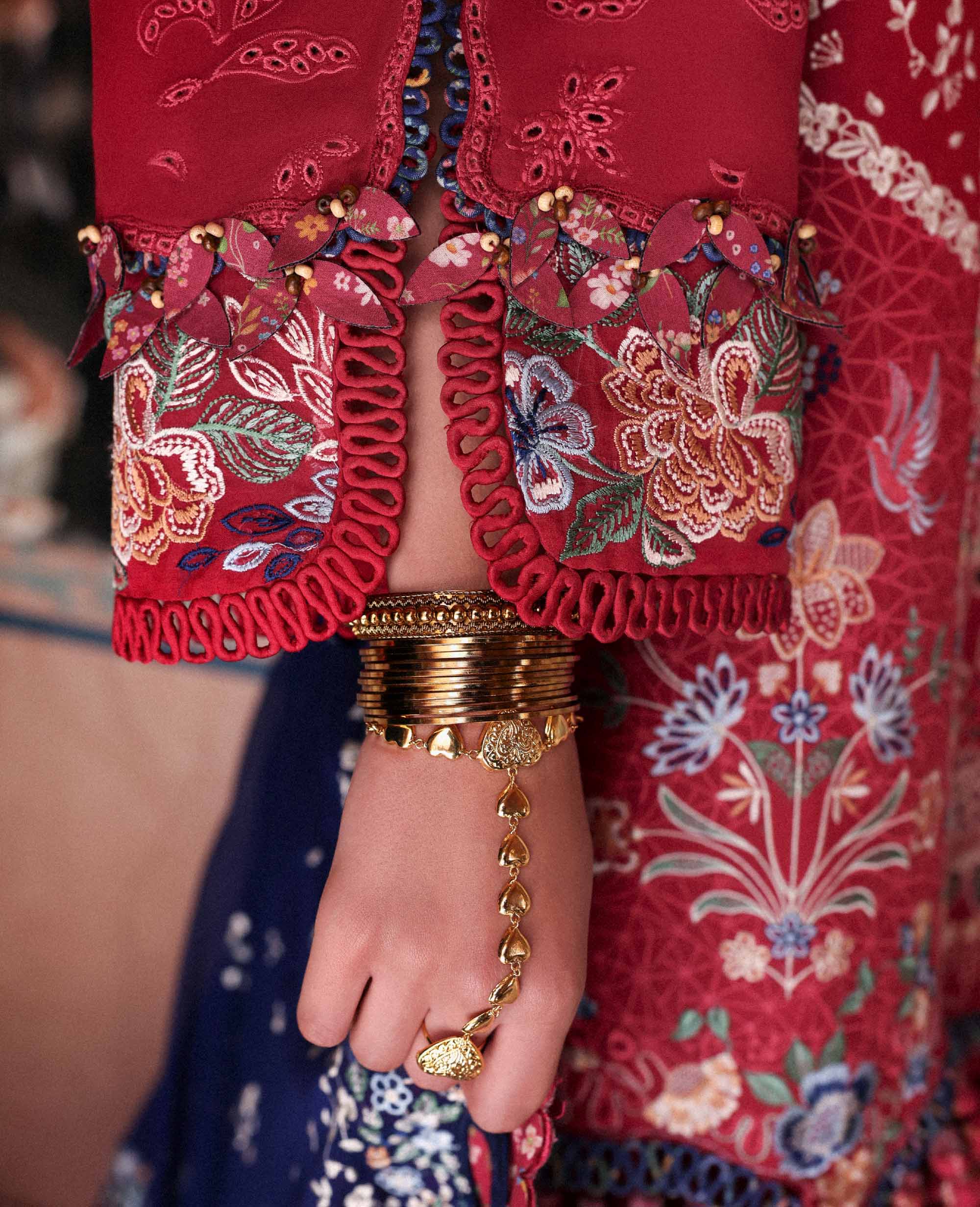 Fabric: This three-panel crimson shirt is designed with intricate laser-printed florals, blending fiery reds and warm corals with refreshing hints of blue and leafy green for a look that feels bold yet beautifully balanced. The sleeves stand out with delicate schiffli-style boring details and a modern slit-open silhouette, finished with a crisp organza border. A richly patterned floral hem adds depth, while the flowing chiffon dupatta is adorned with an all-over floral print and finished with luxe organza appliqué bunches. A striking ensemble, festive, modern, and perfect for standout Eid moments. Neck Embroidered (Organza) 1 Pcs Front Center Panel Embroidered (Lawn) 1 Pcs Front Right Panel Embroidered (Lawn) 1 Pcs Front Left Panel Embroidered (Lawn) 1 Pcs Front Hem Border Embroidered (Organza) 1 Pcs Sleeves Embroidered (Lawn) 22'' Sleeve Border Embroidered (Organza) 1 Pcs Dupatta Embroidered (Georgette Chiffon) 1 Pcs Dupatta Pallu Embroidered (Georgette Chiffon) 1 Pcs Dupatta Motif Embroidered (Organza) 1 Pcs Dupatta Four Side Border Printed (Satin) 1 Pcs Back Dyed (Lawn) 1 Pcs Trousers Dyed (Cambric) 2 MTR |