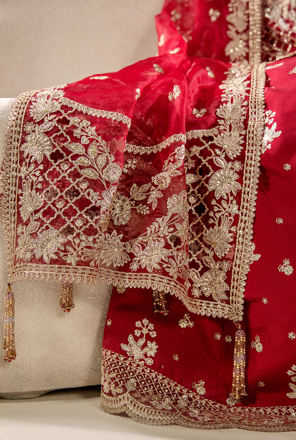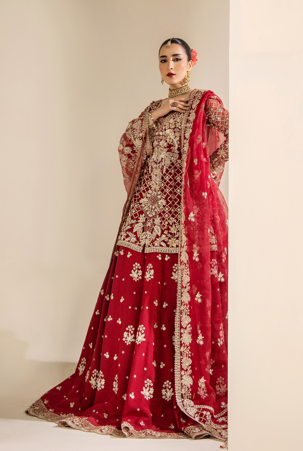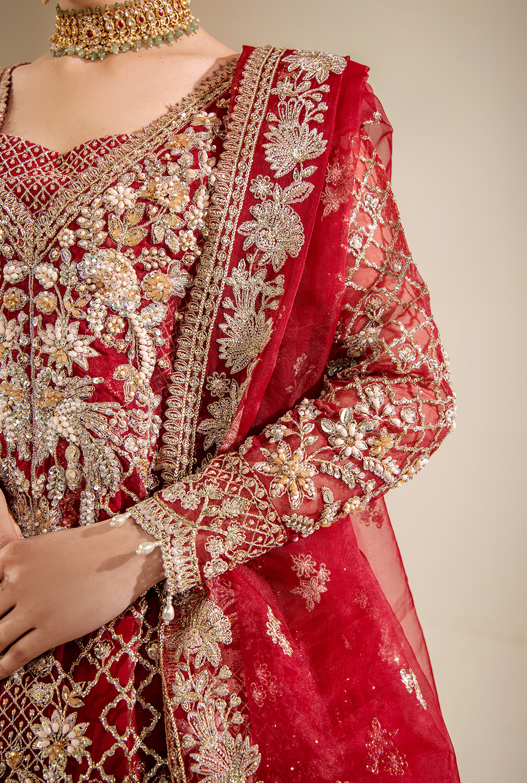 Summary: Experience regal elegance with the Saad Shaikh 'AMÉLIE' Pakistani suit. This exquisite ensemble features a stunning maroon kameez crafted from delicate Organza, perfect for grand celebrations. The shirt is a masterpiece of craftsmanship, adorned with lavish hand-embellished embroidery on the neckline, front panels, and full sleeves. The deep maroon hue, a timeless choice for South Asian festivities, makes this luxury formal wear a quintessential bridal or wedding outfit. This unstitched Pakistani dress allows for custom tailoring, ensuring a flawless fit for your special day. It's the ideal choice for a bride seeking a traditional yet glamorous look.