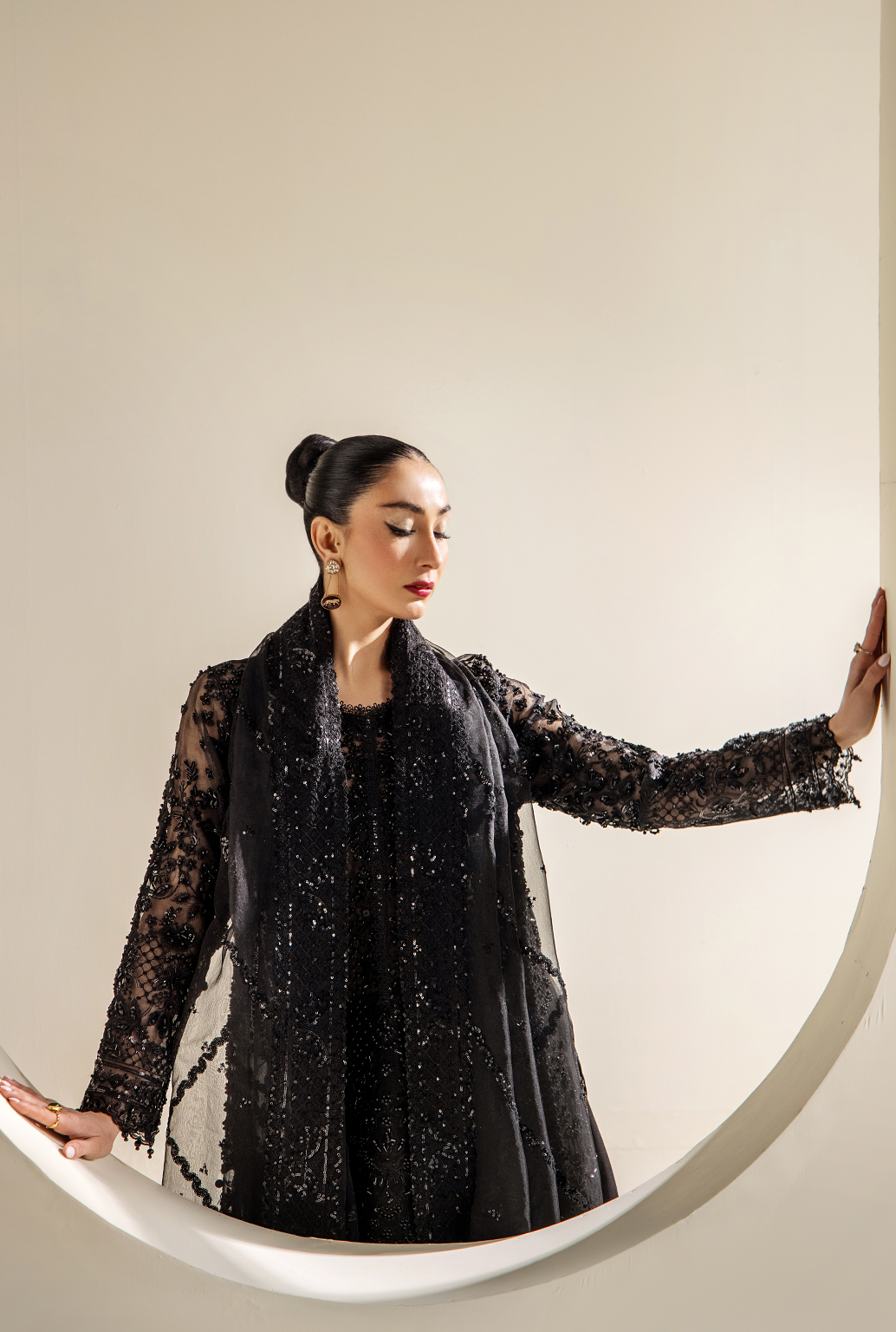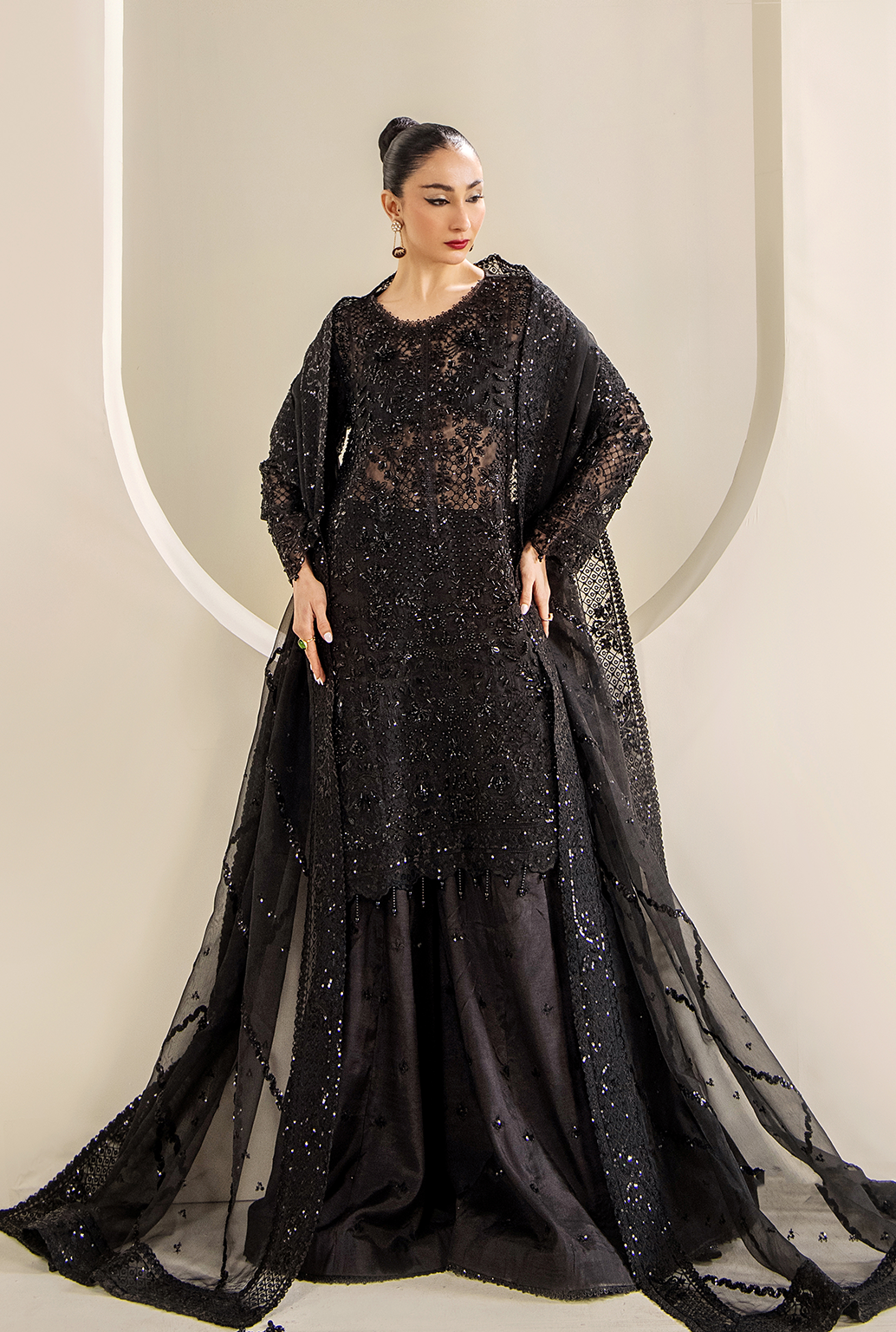 Summary: Exude timeless elegance in the 'Ayla' by Saad Shaikh, a magnificent black Pakistani suit designed for grand occasions. This luxury wedding formal is crafted from exquisite organza, providing a graceful drape perfect for Spring/Summer festivities. The kameez is a masterpiece of craftsmanship, featuring extensive hand-embellished and embroidered panels, sleeves, and borders. The sophisticated black color makes this formal wear a classic choice for evening galas and wedding receptions. This ethnic wear ensemble is the epitome of glamour, making it an ideal choice for anyone looking to make a statement at their next big event.
