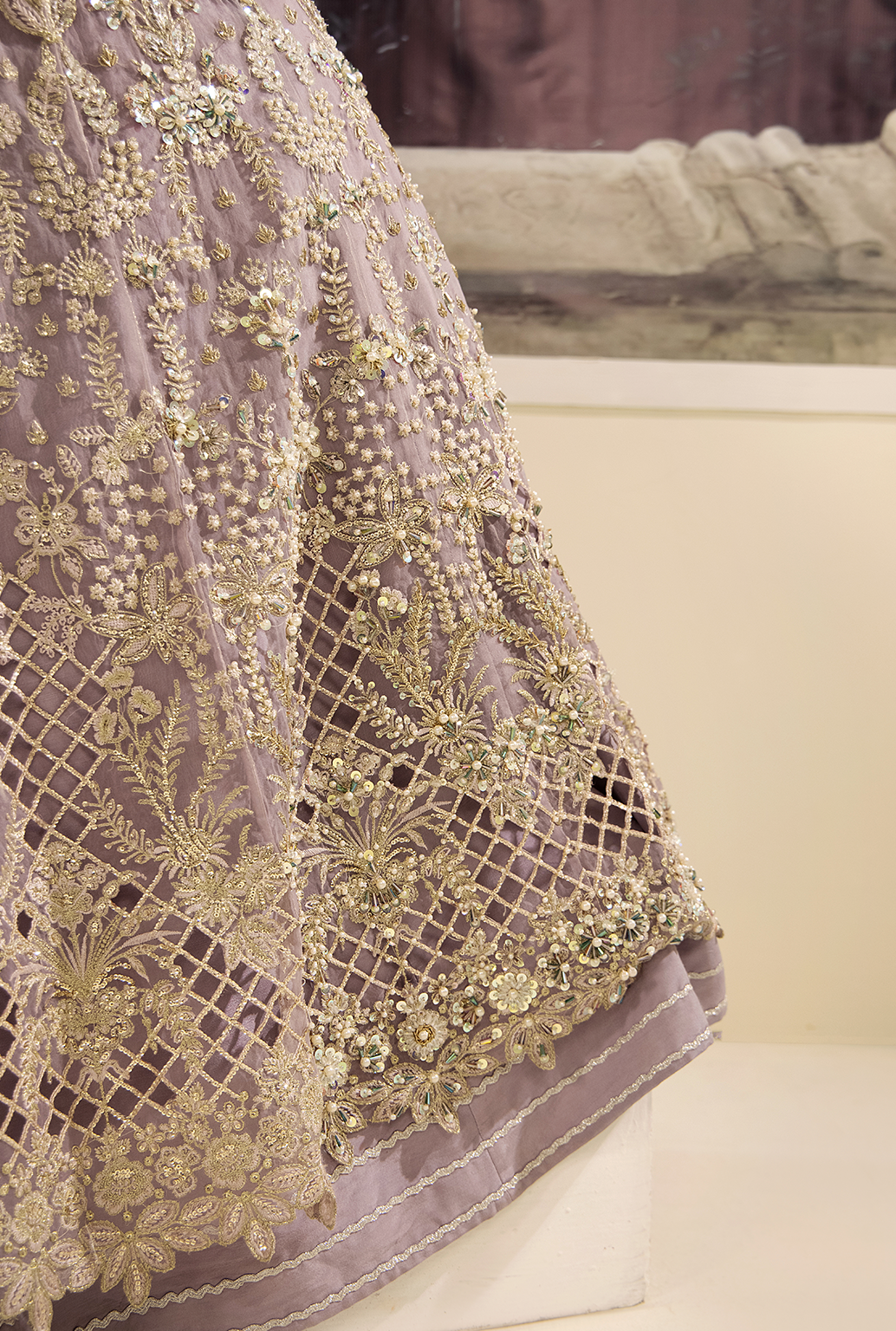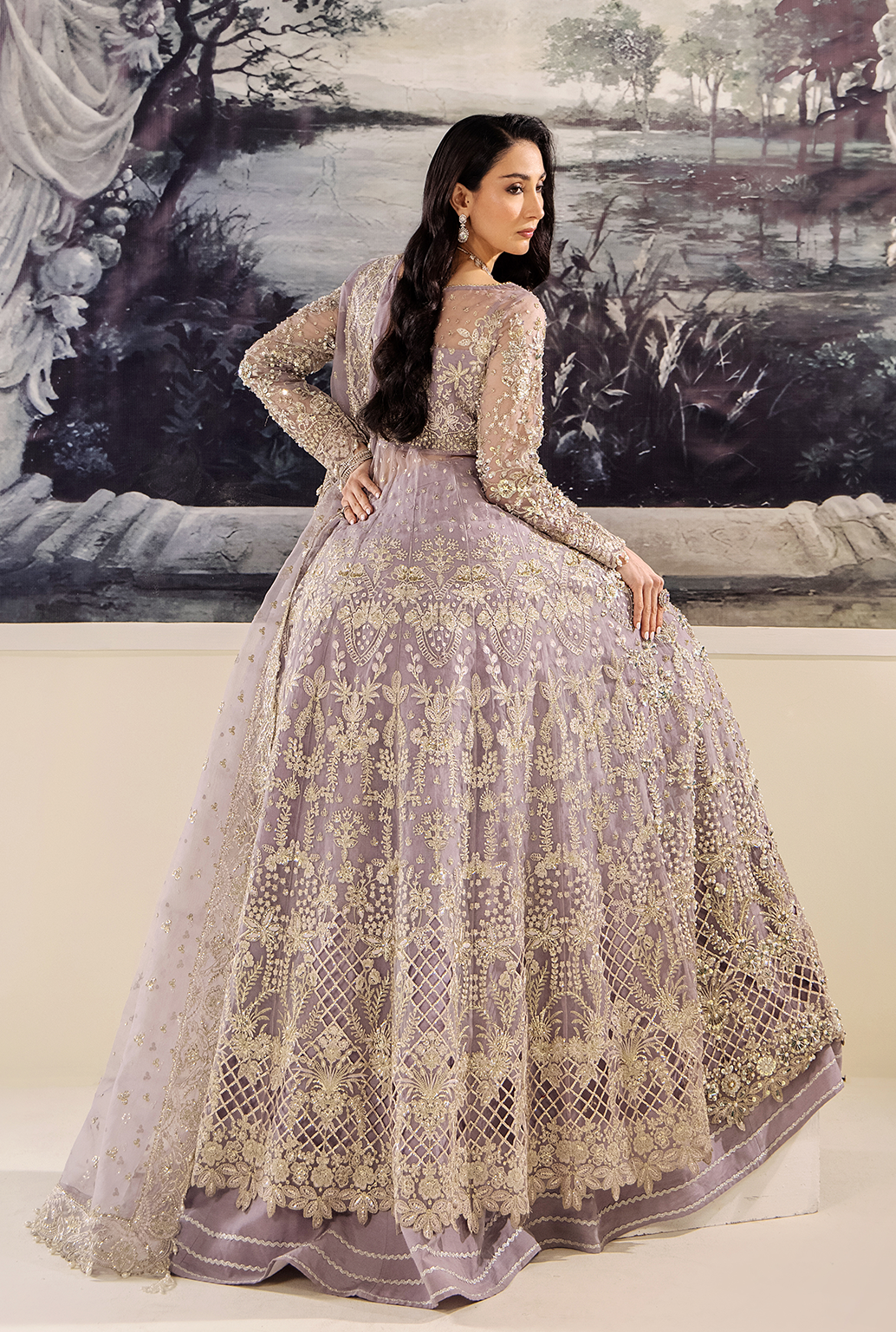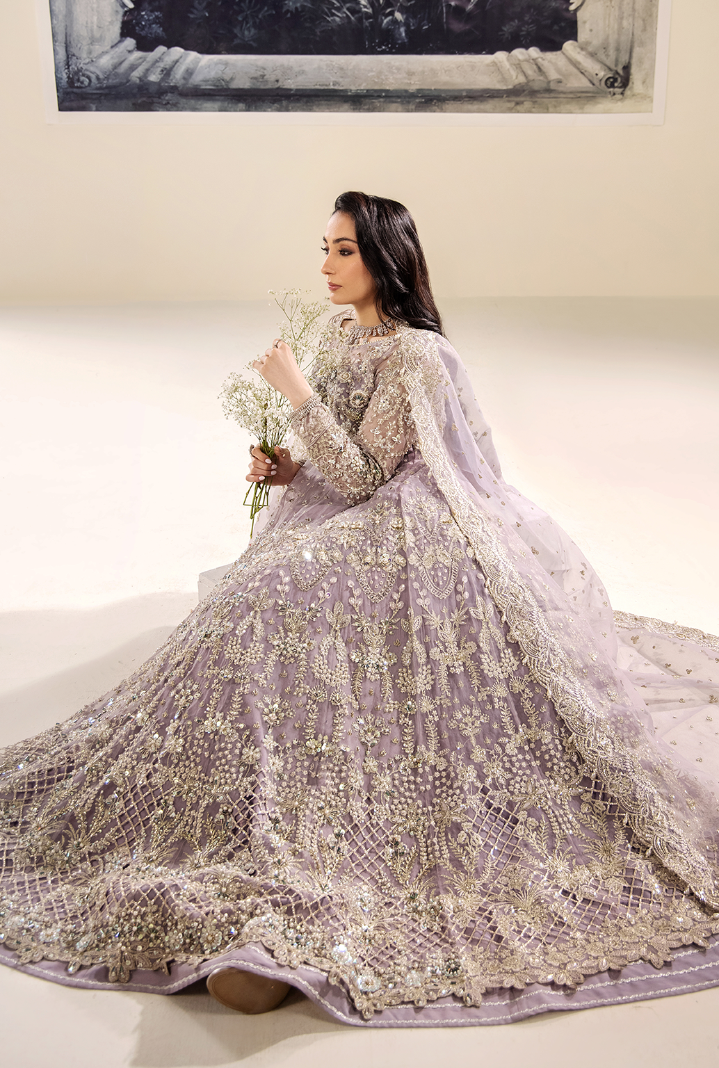 Summary: Discover the exquisite 'Isabella' by Saad Shaikh from the Celestia Luxury Wedding Formals collection. This Pakistani suit is presented in a sophisticated lilac hue, crafted from delicate Net fabric, making it a sublime choice for the Spring/Summer wedding season. The outfit showcases masterful craftsmanship with intricate hand embellishments and detailed embroidery across the front and back body, sleeves, and panels. This ethnic wear masterpiece, with its formal and festive appeal, is perfect for a wedding guest or for a Nikah ceremony. Shop this elegant Pakistani dress to make a statement at any grand celebration.