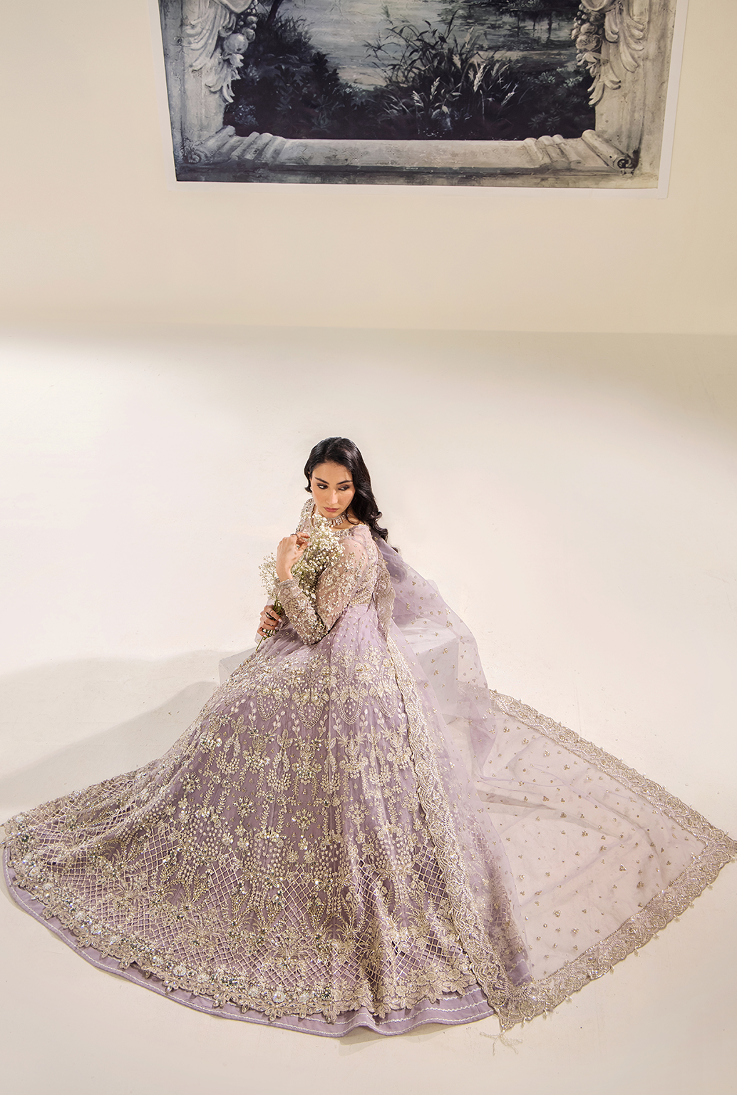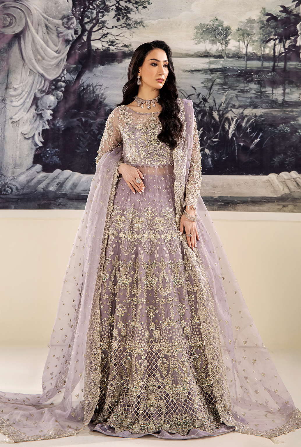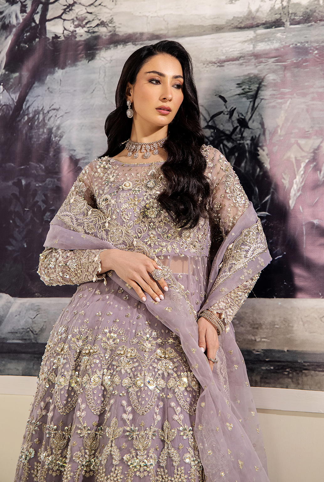 Summary: Discover the exquisite 'Isabella' by Saad Shaikh from the Celestia Luxury Wedding Formals collection. This Pakistani suit is presented in a sophisticated lilac hue, crafted from delicate Net fabric, making it a sublime choice for the Spring/Summer wedding season. The outfit showcases masterful craftsmanship with intricate hand embellishments and detailed embroidery across the front and back body, sleeves, and panels. This ethnic wear masterpiece, with its formal and festive appeal, is perfect for a wedding guest or for a Nikah ceremony. Shop this elegant Pakistani dress to make a statement at any grand celebration.