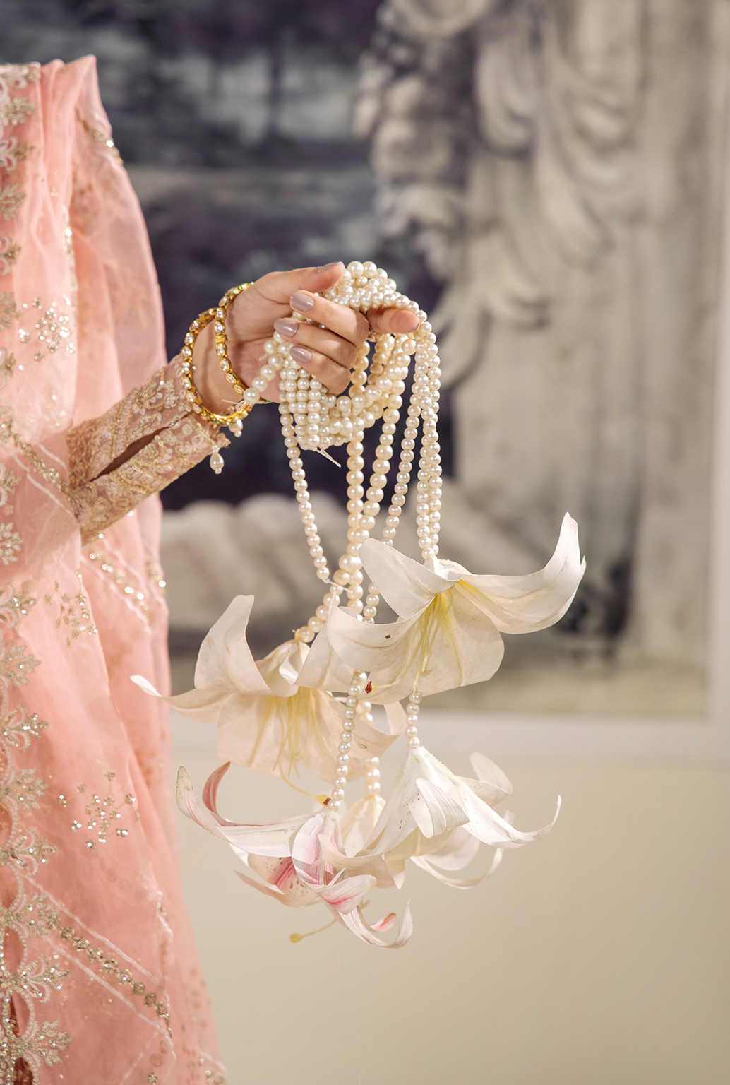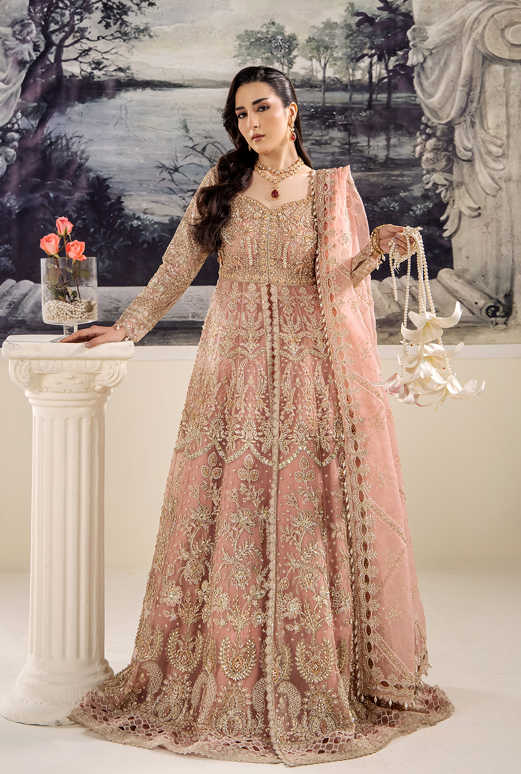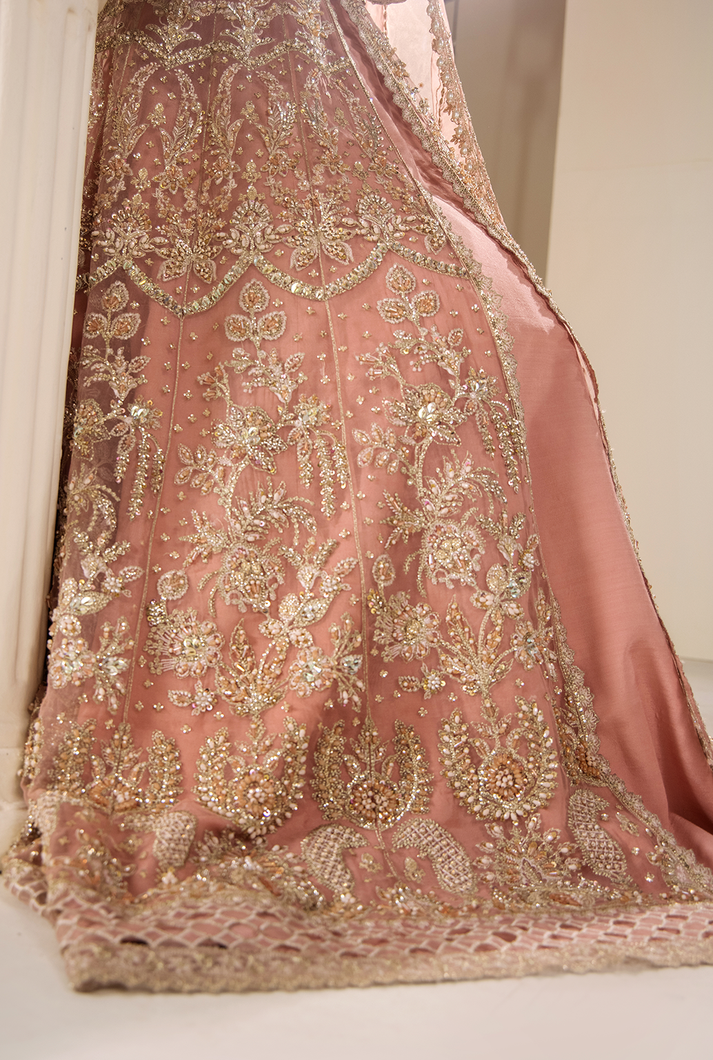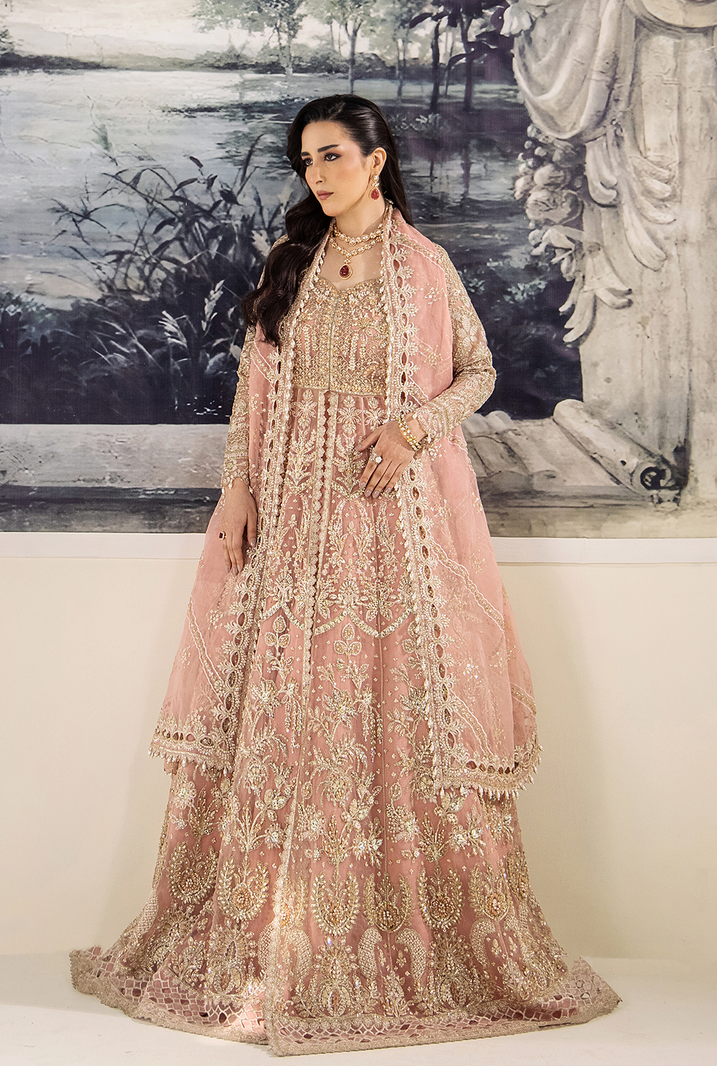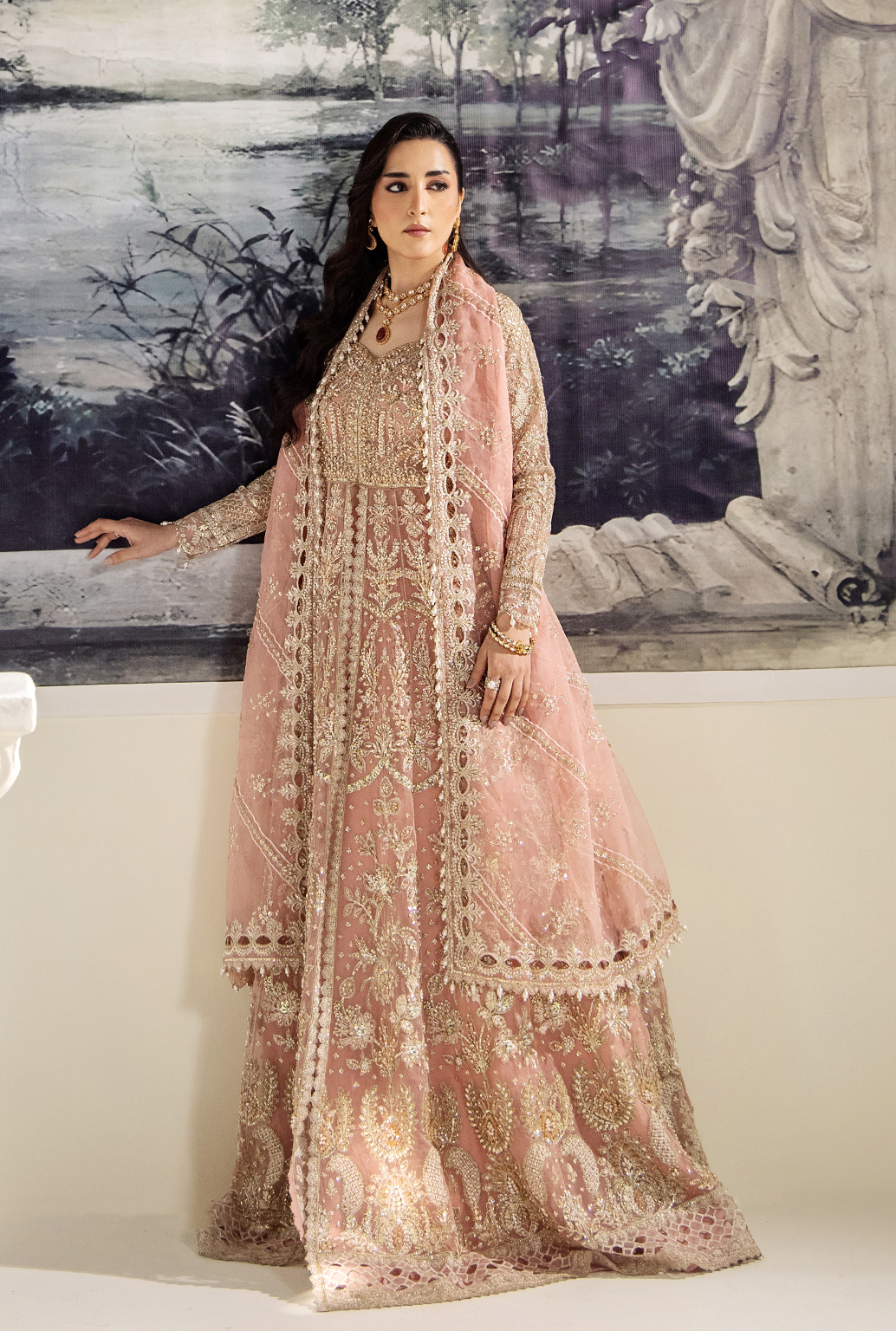 Summary: Embrace regal elegance with the Saad Shaikh Celestia 'ROSÉE' Pakistani Suit. This stunning ensemble features an exquisitely crafted kameez in a delicate pink hue on a sheer net base. The design is a masterpiece of artistry, with extensive hand embellishments and intricate embroidery gracing the front, back, and sleeves. Its flowing silhouette and detailed panels create a look of timeless grace. Perfect for Spring/Summer formal events, this luxury outfit is a quintessential choice for wedding wear or as a sophisticated festive garment. Shop this ethnic wear masterpiece to make a lasting impression at any grand celebration.