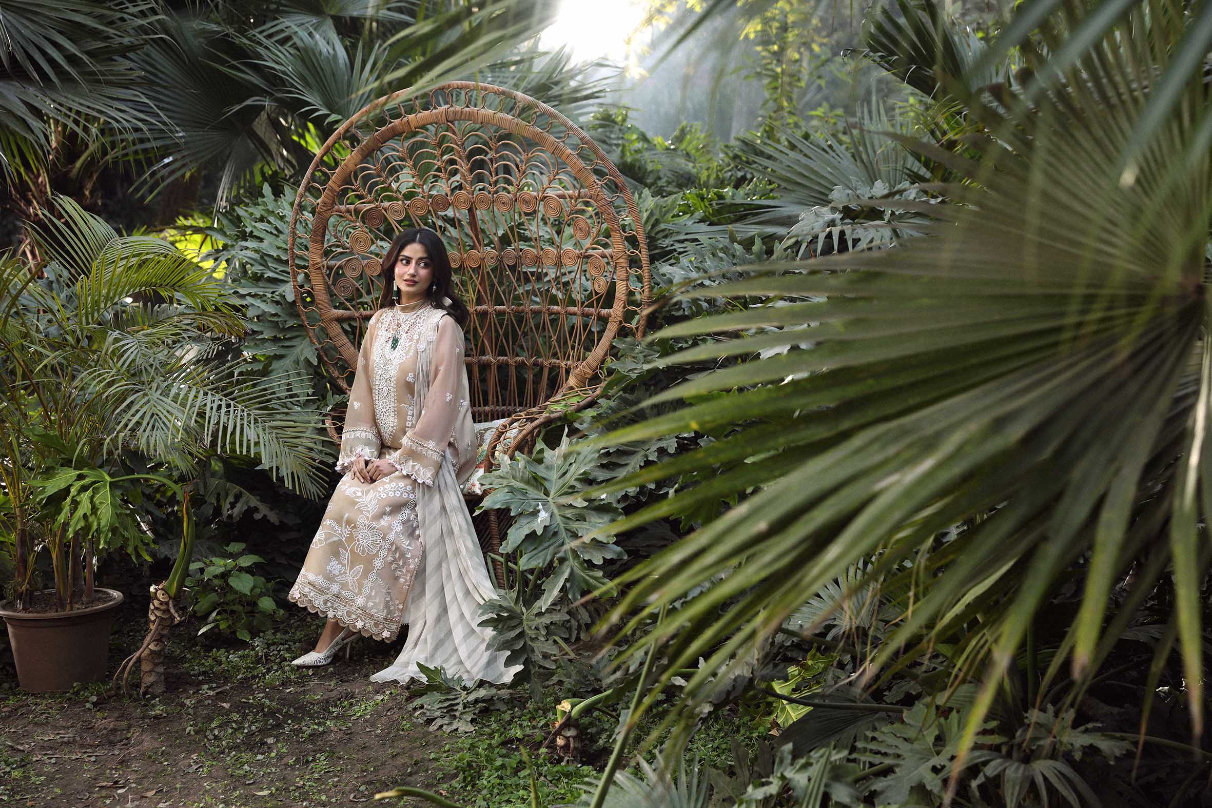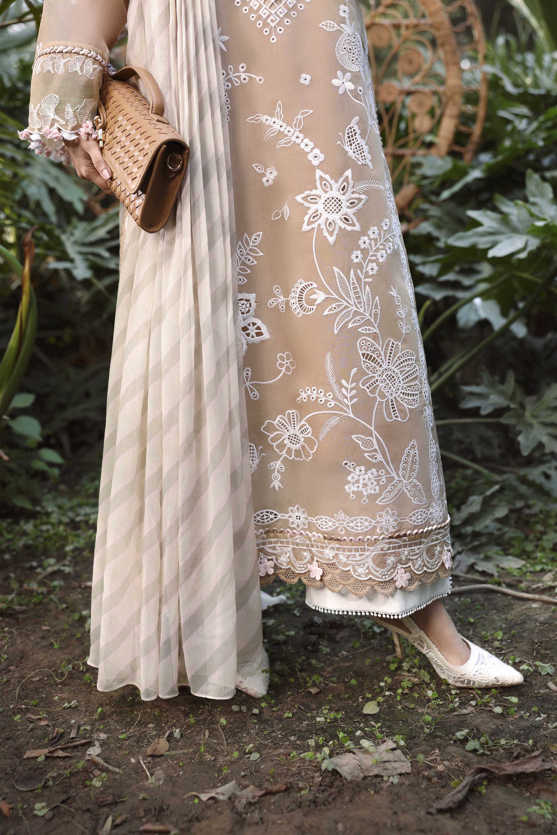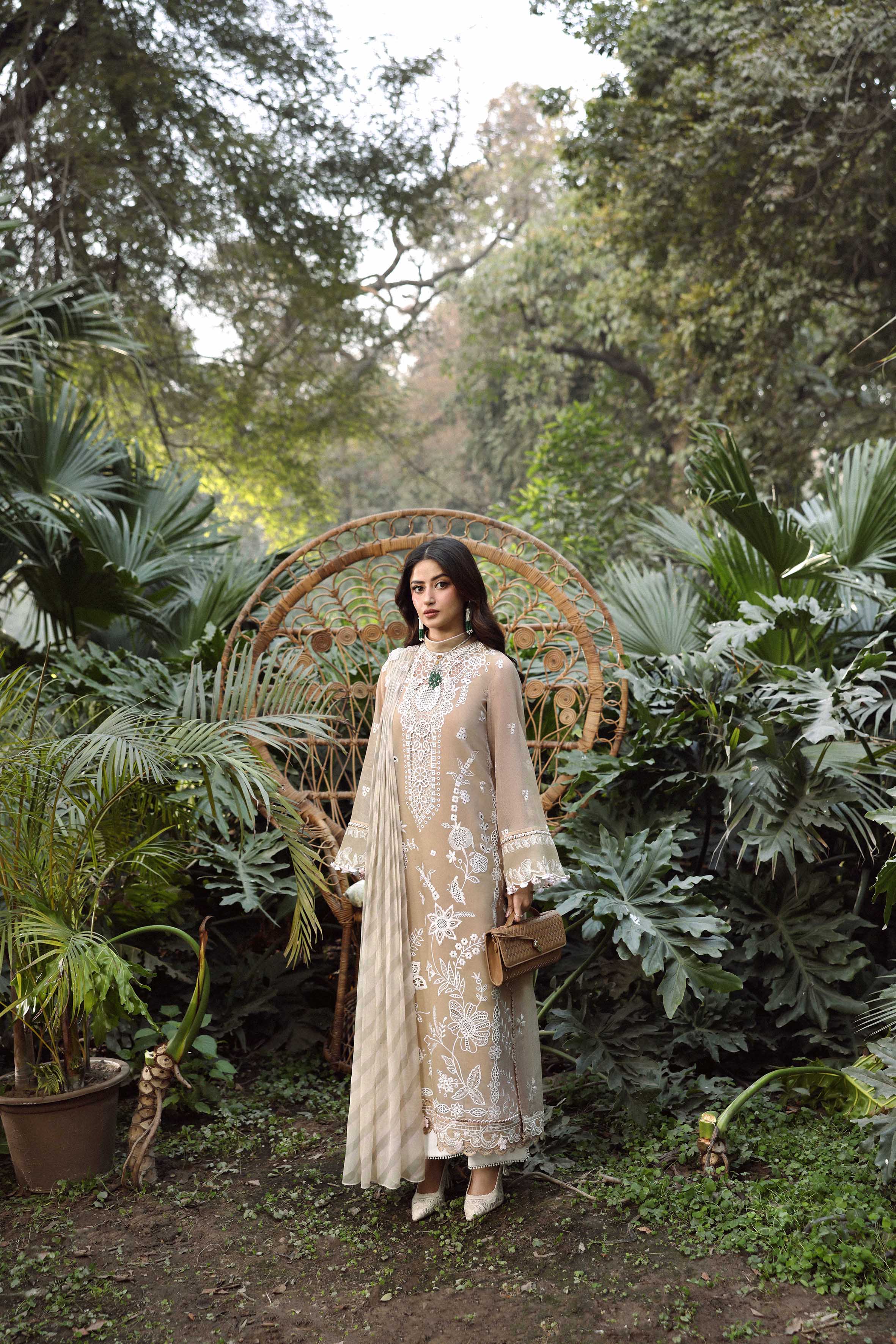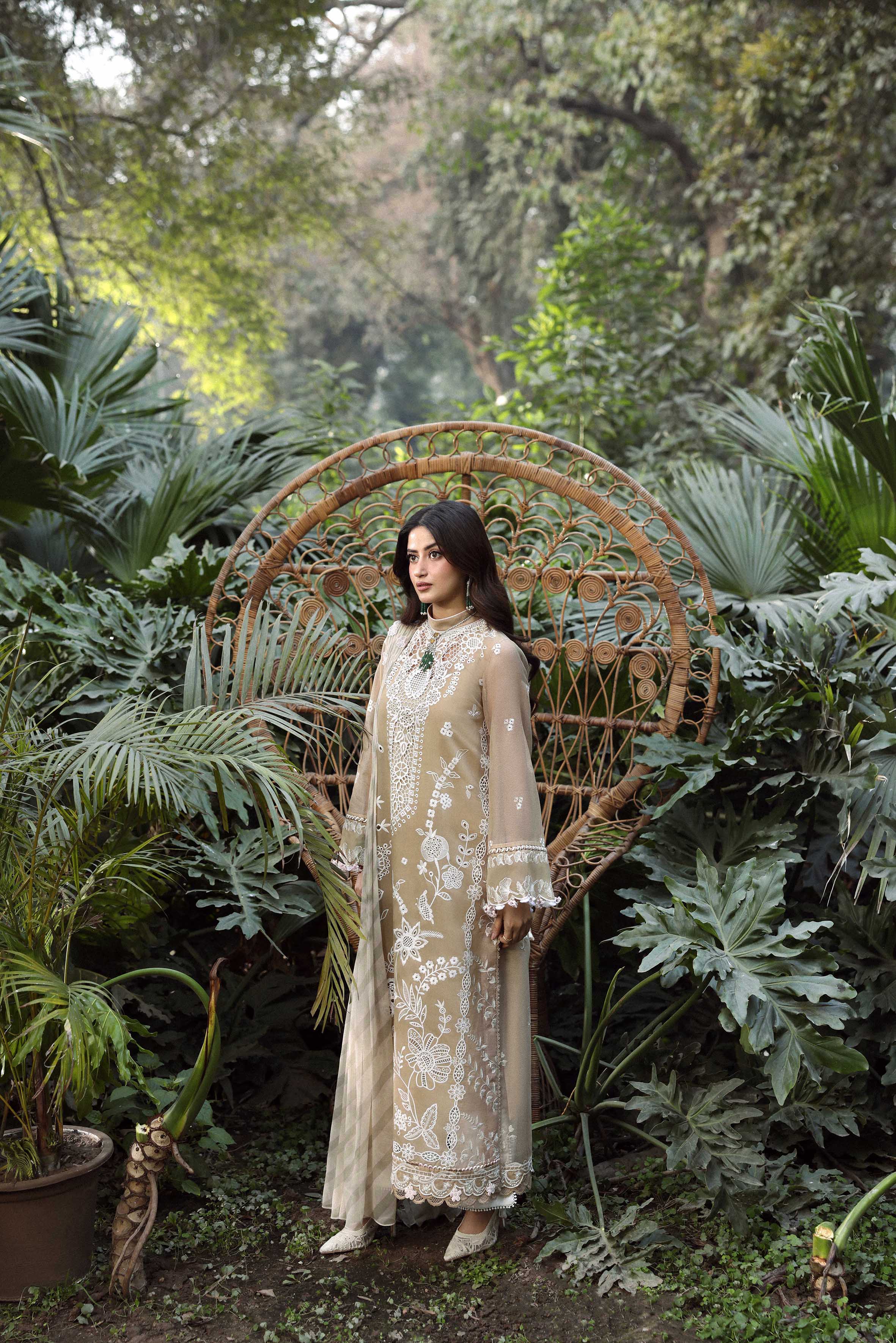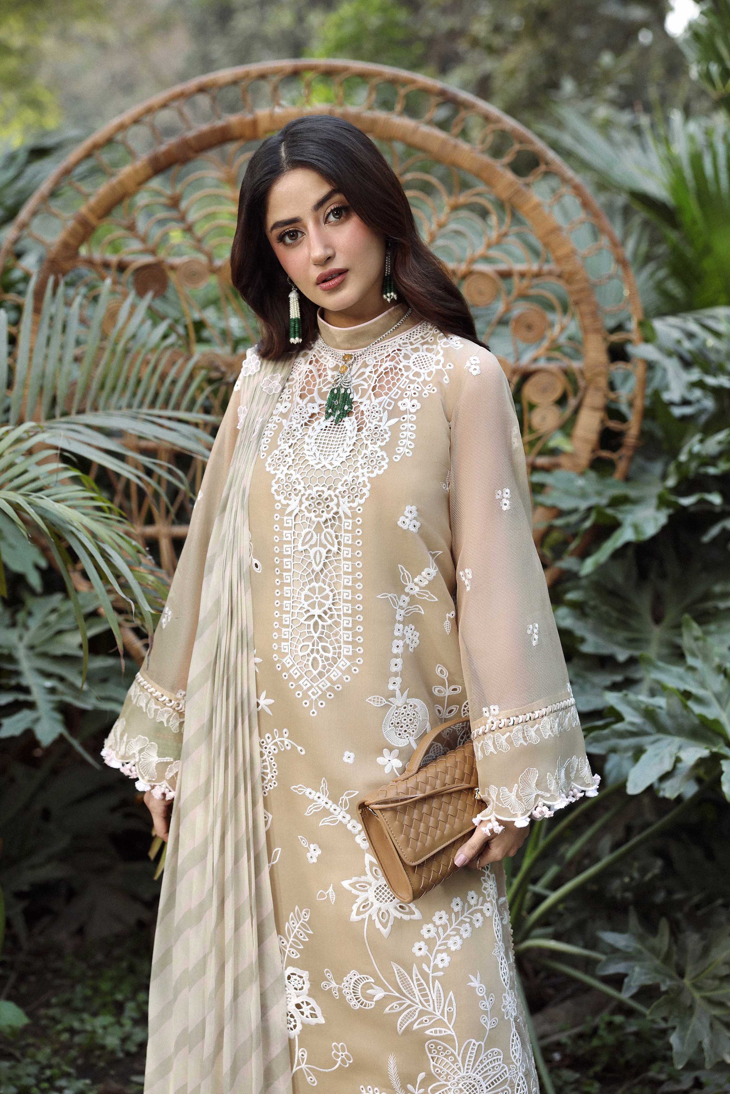 Summary: Embrace timeless elegance with this Beige Pakistani suit from the Sable Vogue Luxury Formals collection, modeled by the graceful Sajal Aly. This exquisite ensemble features a front center panel crafted from premium Swiss Voile (Lawn) adorned with intricate Schiffli boring and white floral embroidery, creating a sophisticated textured look. The design is elevated with delicate Net sleeves and side panels, blending traditional craftsmanship with modern sheer aesthetics. Paired with a luxurious digital printed Silk dupatta and a classic trouser, this outfit is the epitome of Summer festive fashion. Ideal for Eid celebrations, formal gatherings, or weddings, this unstitched dress material offers breathable luxury and refined style.