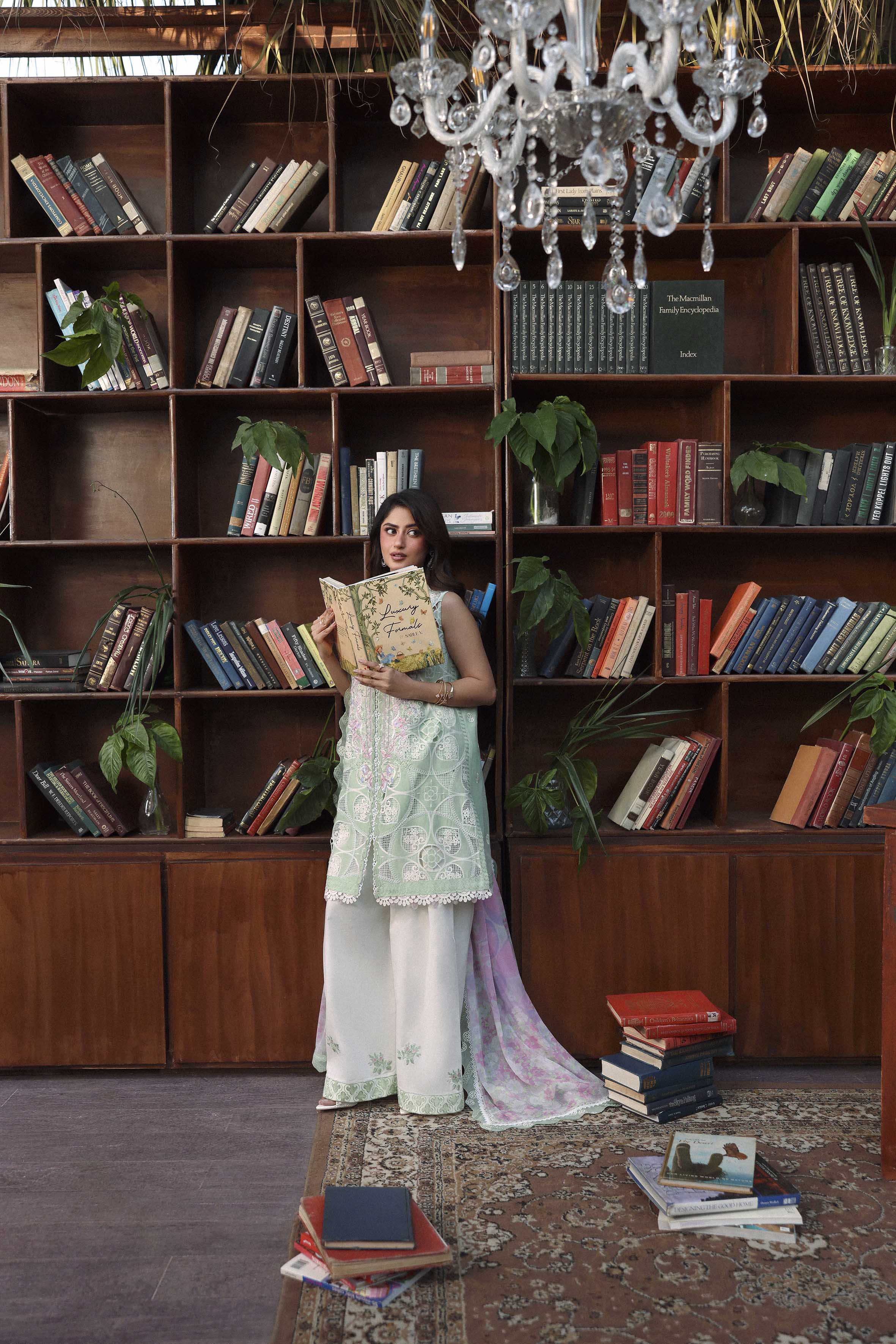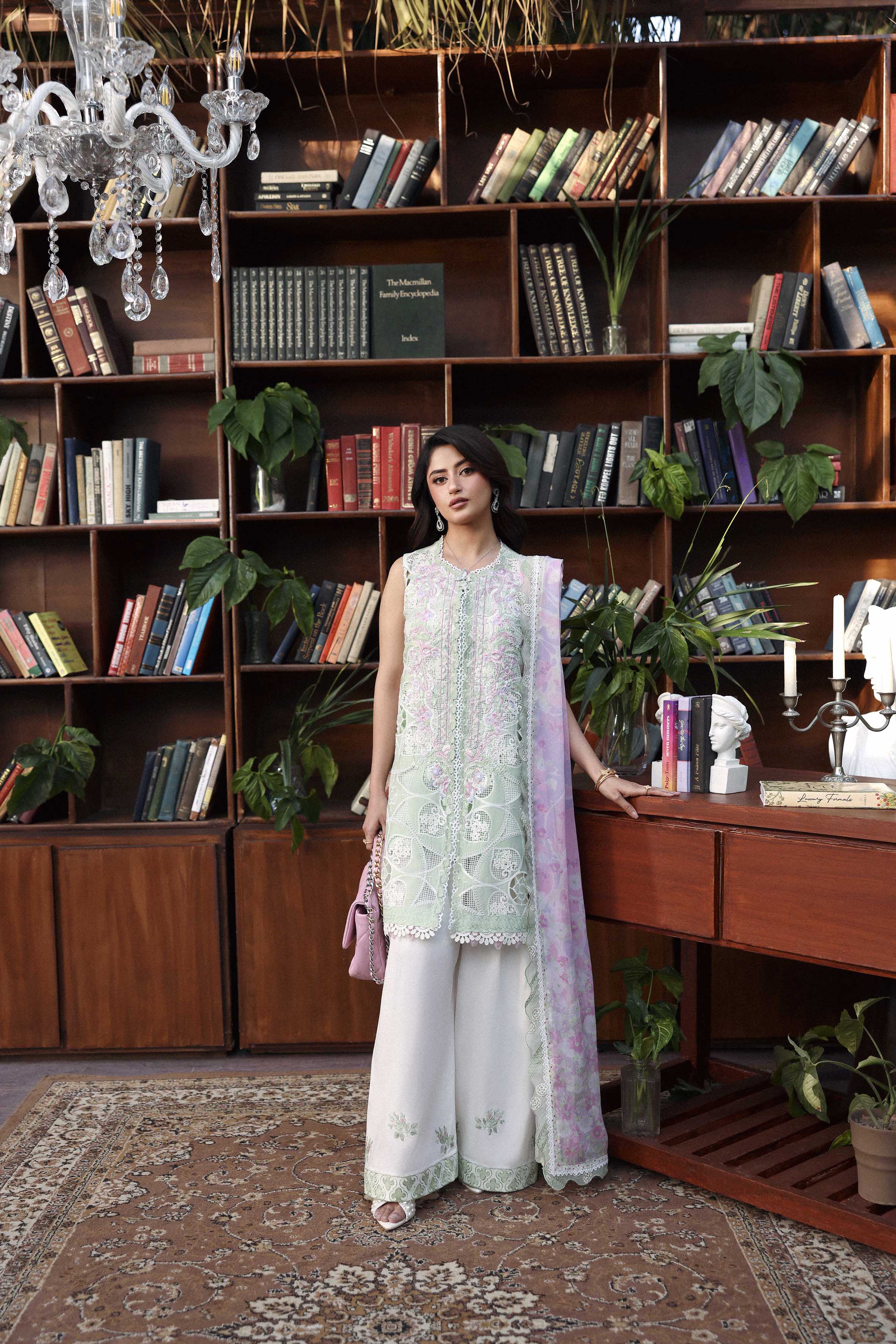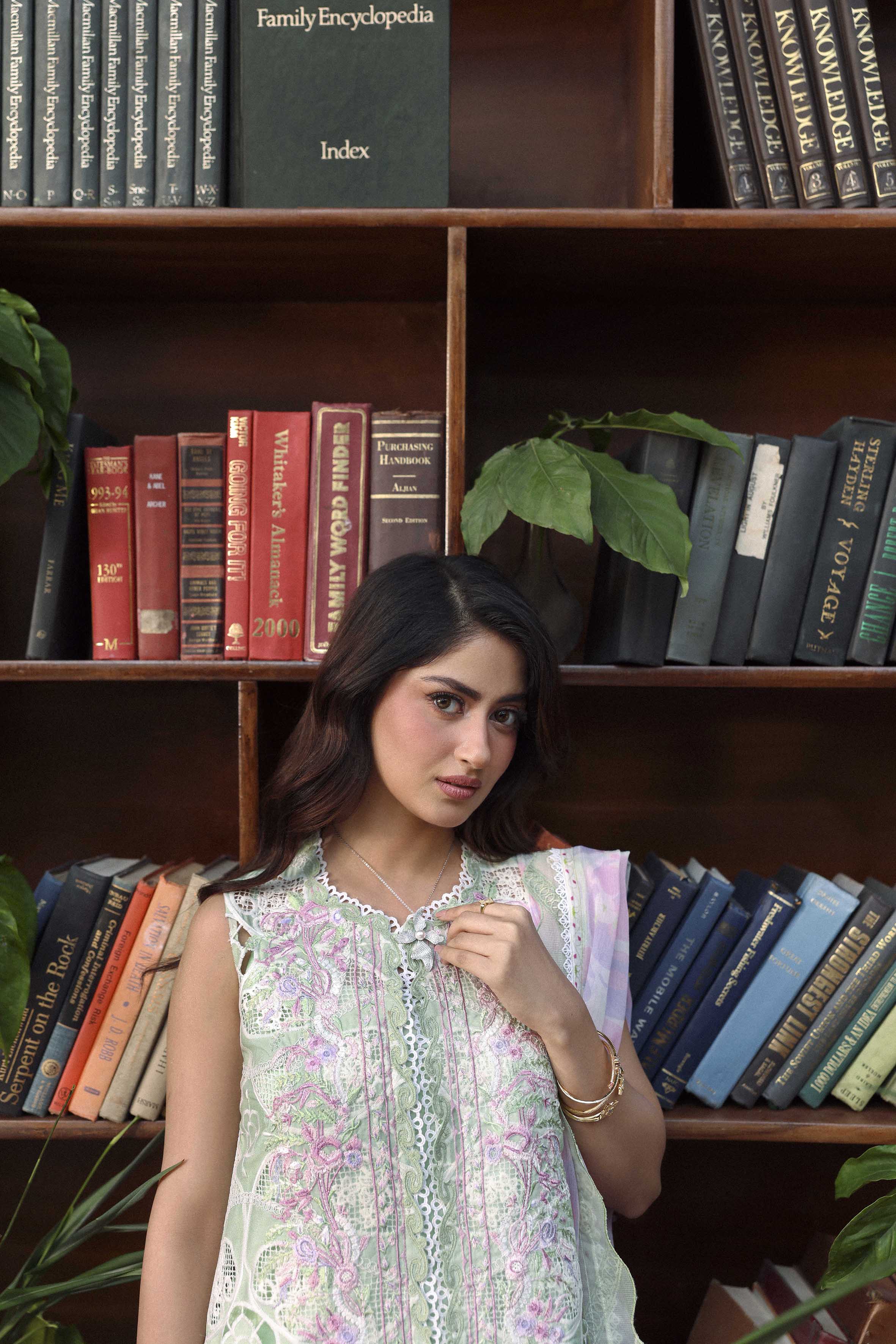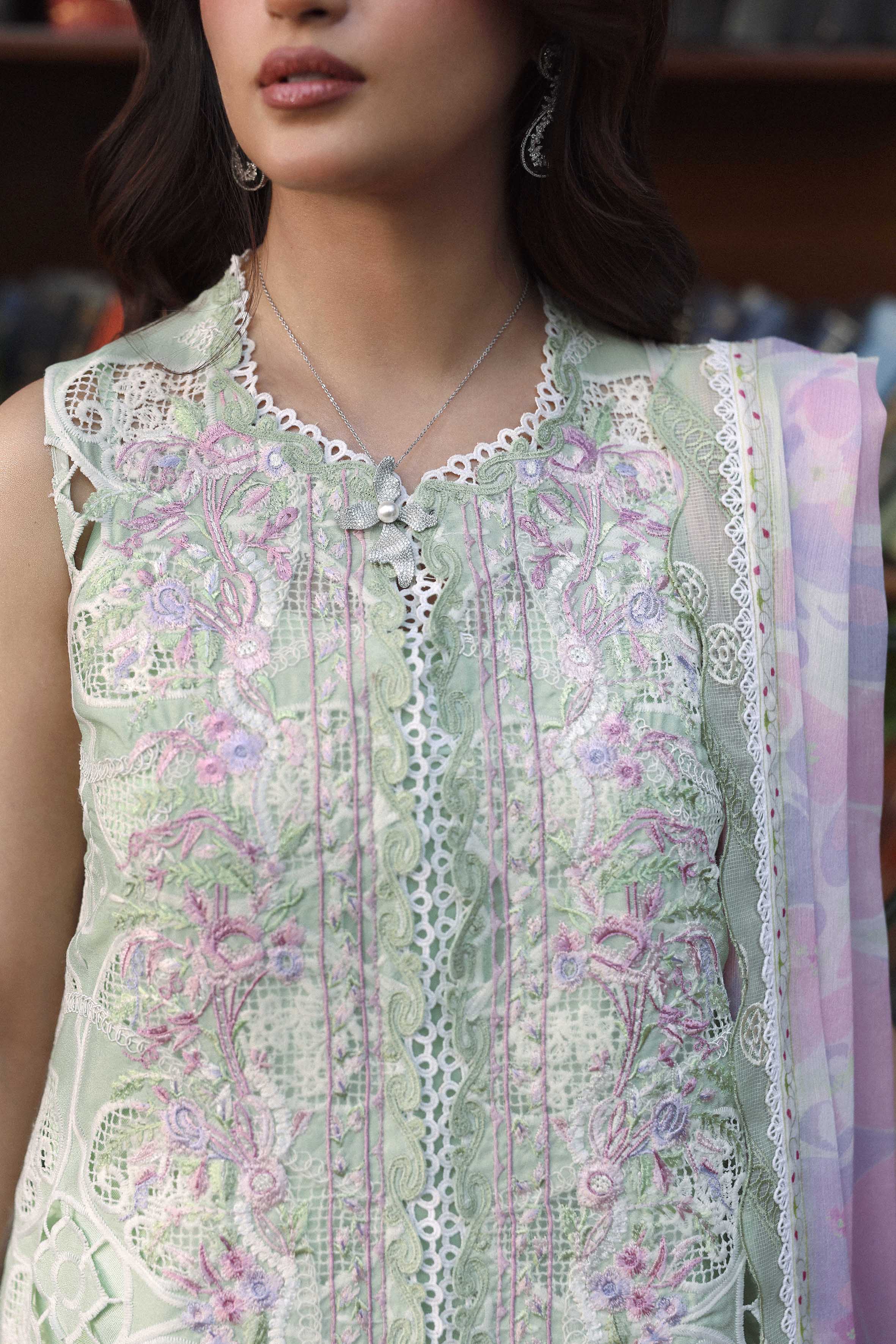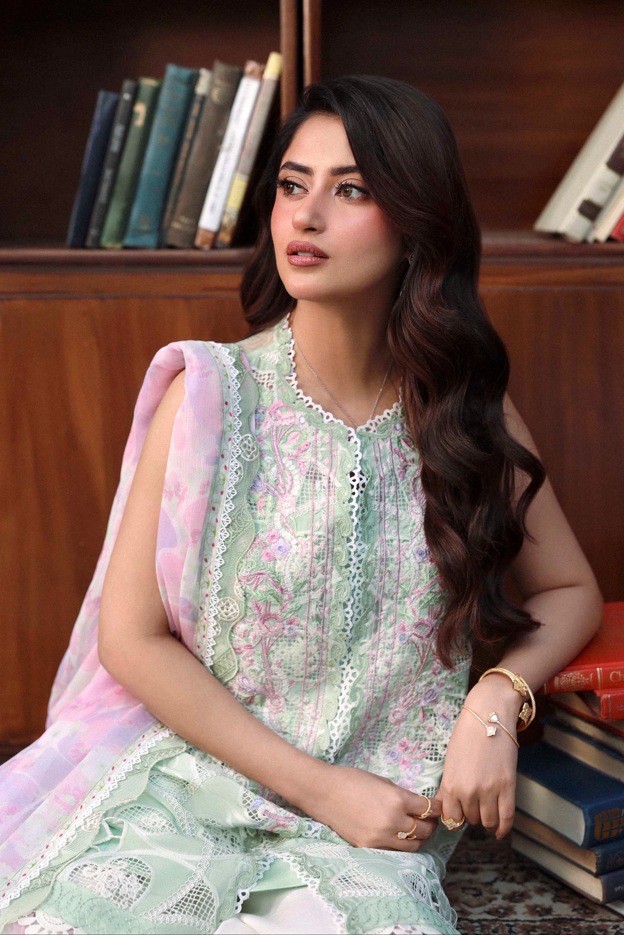 Summary: Radiate elegance in this exquisite Green Pakistani suit worn by the stunning Sajal Aly. Part of the Sable Vogue Luxury Formals collection, this ensemble features a meticulously crafted shirt adorned with intricate Schiffli embroidery and boring cutwork on Swiss Voile, creating a breathtaking visual texture. The pastel green hue is perfectly complemented by delicate pink floral accents, evoking the freshness of Spring/Summer. Paired with a digital printed Chiffon dupatta in soft lavender and pink tones, this unstitched dress material is the epitome of sophistication. Ideal for festive occasions, Eid celebrations, or Mehndi functions, this luxury outfit promises a regal look. Shop this authentic Pakistani dress online to elevate your party wear wardrobe.