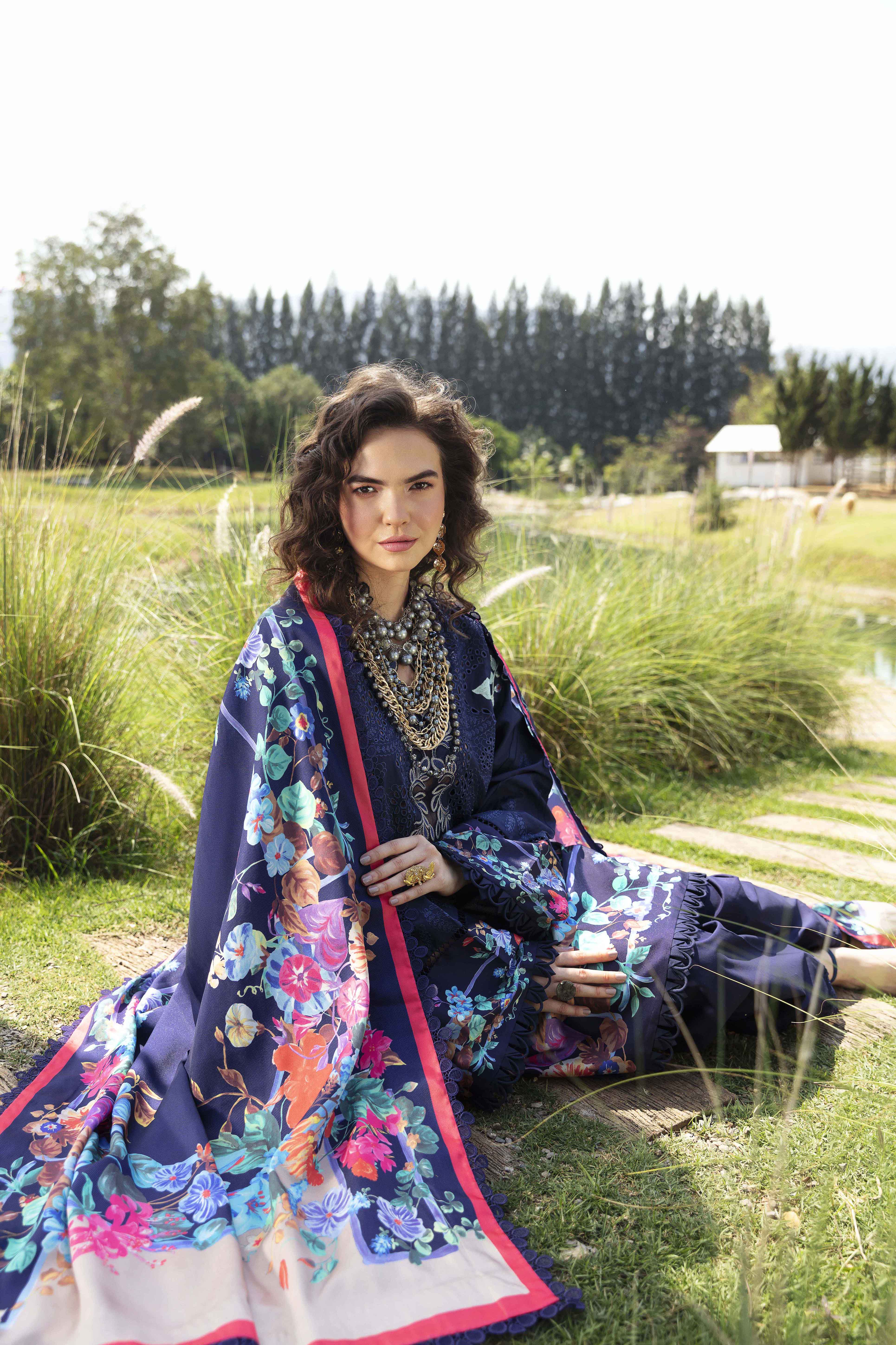 Fabric: BLOSSOM LUXURY LAWN 24 3 PIECE ATTIRE SL-13-24 Introducing BLOSSOM, where elegance meets contemporary charm in perfect harmony. The shirt features embroidered panels in soft lawn fabric on the right and left, adding a touch of sophistication to your ensemble. The connecting neckline, delicately embroidered in organza, enhances the overall allure. The front extension fabric, dyed in lawn, offers a seamless flow to the ensemble, while the dyed back ensures a balanced look. Embroidered front border in organza adds a hint of opulence to the design. Paired with a digital printed silk dupatta featuring a printed silk border, the outfit exudes a modern yet refined aesthetic. The sleeves boast intricate embroidery in lawn fabric, complemented by a printed silk border attached with the dupatta. Complete your ensemble with a dyed cambric trouser, ensuring comfort and style for any occasion. Elevate your look with BLOSSOM, where sophistication meets contemporary elegance effortlessly. THIS ARTICLE INCLUDES FRONT * EMBROIDERED NECK ON NAVY BLUE ORGANZA 01 * EMBROIDERED FRONT RIGHT PANEL ON NAVY BLUE LAWN FABRIC W-13""01 * EMBROIDERED FRONT LEFT PANEL ON NAVY BLUE LAWN FABRIC W-13"" 01 * EMBROIDERED FRONT HEM BORDER ON NAVY BLUE ORGANZA 40"" 01 * DIGITAL PRINTED FRONT BORDER (ATTACHED WITH DUP) 01 * FRONT SIDE KALI LEFT & RIGHT DYED LAWN FABRIC W-13"" 01 BACK * BACK DYED LAWN FABRIC L-40"" 01 * DIGITAL PRINTED BACK BORDER (ATTACHED WITH DUP) 01 SLEEVES * EMBROIDERED SLEEVES ON NAVY BLUE LAWN FABRIC 26"" 01 * DIGITAL PRINTED SLEEVES BORDER (ATTACHED WITH DUP) 01 DUPATTA * DIGITAL PRINTED DUPATTA ON SILK FABRIC 2.5M 01 TROUSER * DYED COTTON TROUSER 2.5M 01 |
