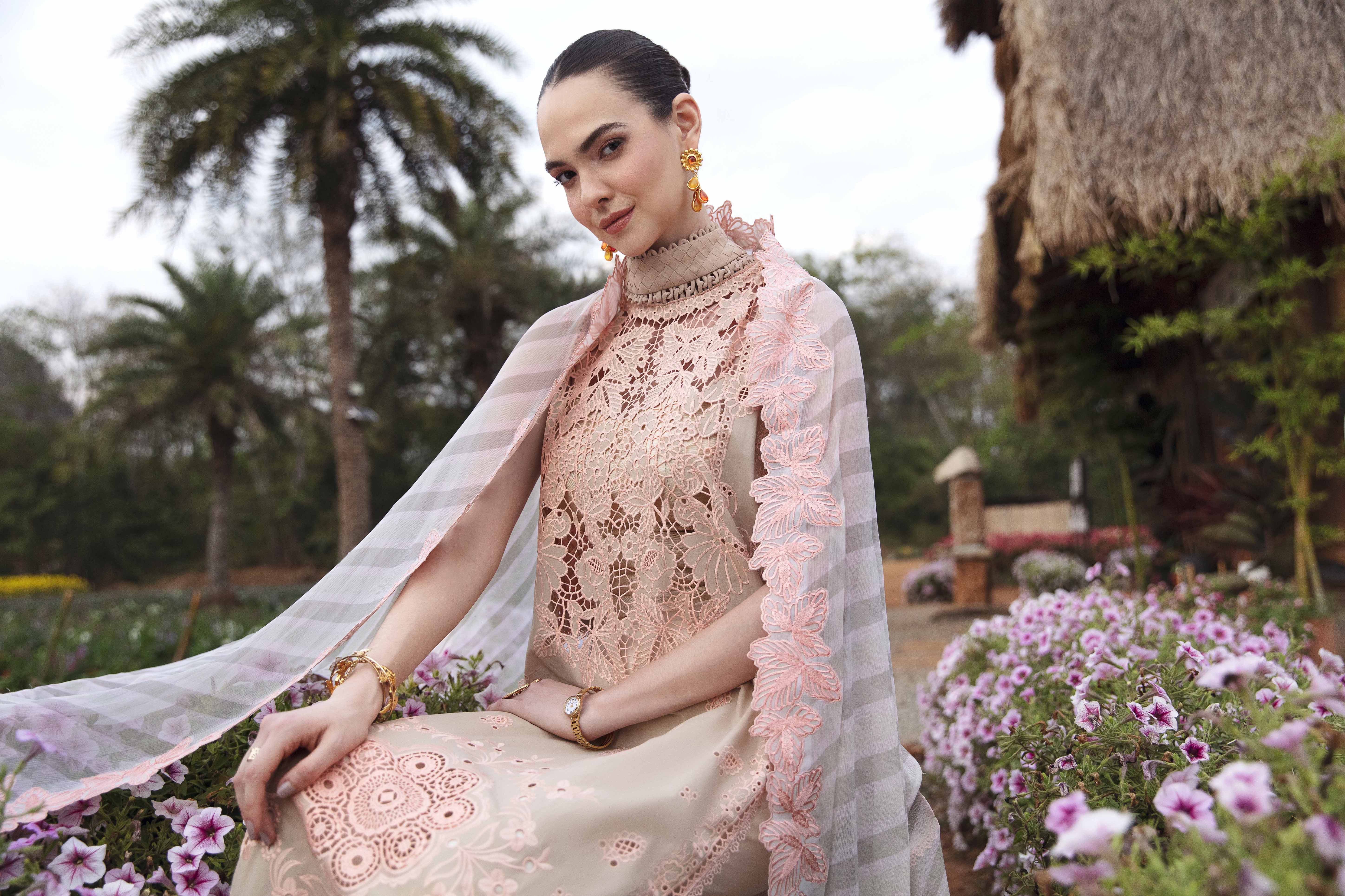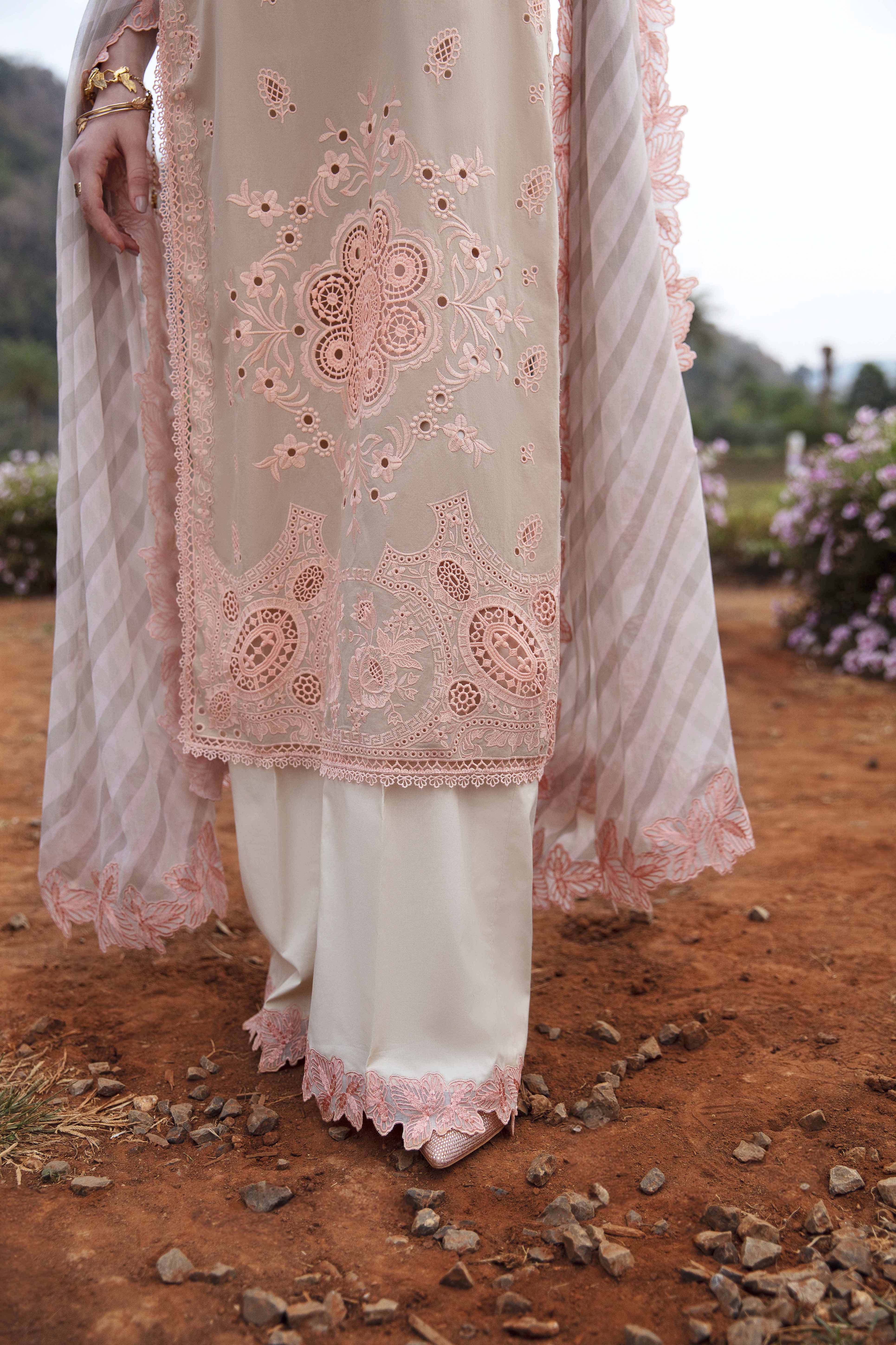 Fabric: CLARA LUXURY LAWN 24 3 PIECE ATTIRE SL-06-24 Introducing CLARA, a captivating blend of tradition and modernity that epitomizes timeless sophistication. The shirt features a mesmerizing Schiffli embroidered front center panel in Swiss lawn, elegantly complemented by embroidered panels in lawn on both sides, creating a harmonious balance of intricate details. The embroidered back adds an extra layer of charm to the ensemble. Paired with a luxurious dyed cotton silk slip, the outfit boasts embroidered sleeves adorned with delicate borders in organza, adding a touch of ethereal beauty. Enhancing the ensemble is a digital printed chiffon dupatta with an opulent embroidered border in organza, spanning an impressive 8 meters, ensuring a regal presence with every drape. Complete your ensemble with a dyed cambric trouser, exuding effortless grace and sophistication for any occasion. THIS ARTICLE INCLUDES FRONT * SCHIFFLI EMBROIDERED FRONT PANEL (SWISS LAWN) W-20"" L-50"" 01 * EMBROIDERED FRONT LEFT PANEL ON LAWN FABRIC W-07"" L-50"" 01 * EMBROIDERED FRONT RIGHT PANEL ON LAWN FABRIC W-7"" L-50"" 01 BACK * EMBROIDERED BACK ON LAWN FABRIC W-40"" L-50"" 01 SLEEVES * EMBROIDERED SLEEVES ON LAWN FABRIC 26"" 01 * SLEEVES BORDER ON CREAM ORGANZA 40"" 01 SLIP * DYED COTTON SILK SLIP 1M 01 DUPATTA * DIGITAL PRINTED CHIFON DUPATTA 2.5M * EMBROIDERED DUPATTA BORDER ON CREAM ORGANZA 8M 01 TROUSER * DYED COTTON TROUSER 2.5M 01 |