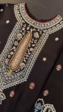 Summary: Embrace winter elegance with this stunning black Pakistani suit from the Sadaf Fawad Khan Siraa collection. The kameez is crafted from soft, warm Marina fabric, making it an ideal choice for the Fall/Winter season. It features magnificent and intricate Kashmiri embroidery across the neckline and sleeves, showcasing timeless craftsmanship. This black ethnic wear ensemble is a perfect example of sophisticated formal wear, making it an excellent choice for winter weddings, evening parties, and festive gatherings. This unstitched dress offers a classic silhouette for a graceful and poetic look.