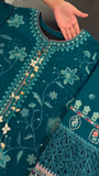 Summary: Embrace winter elegance with the 'Mahpari' Pakistani Suit from Sadaf Fawad Khan's Siraa Winter collection. This stunning ethnic wear is crafted from rich, jewel-toned emerald green Khaddar, a fabric synonymous with warmth and comfort in the colder months. The shirt features exquisite tonal floral embroidery creating a sophisticated jaal across the front panels. This formal wear, with its deep green hue, is a perfect choice for winter weddings or festive celebrations like Mehndi. A quintessential winter outfit, this Pakistani dress promises a graceful and regal look for any formal occasion.