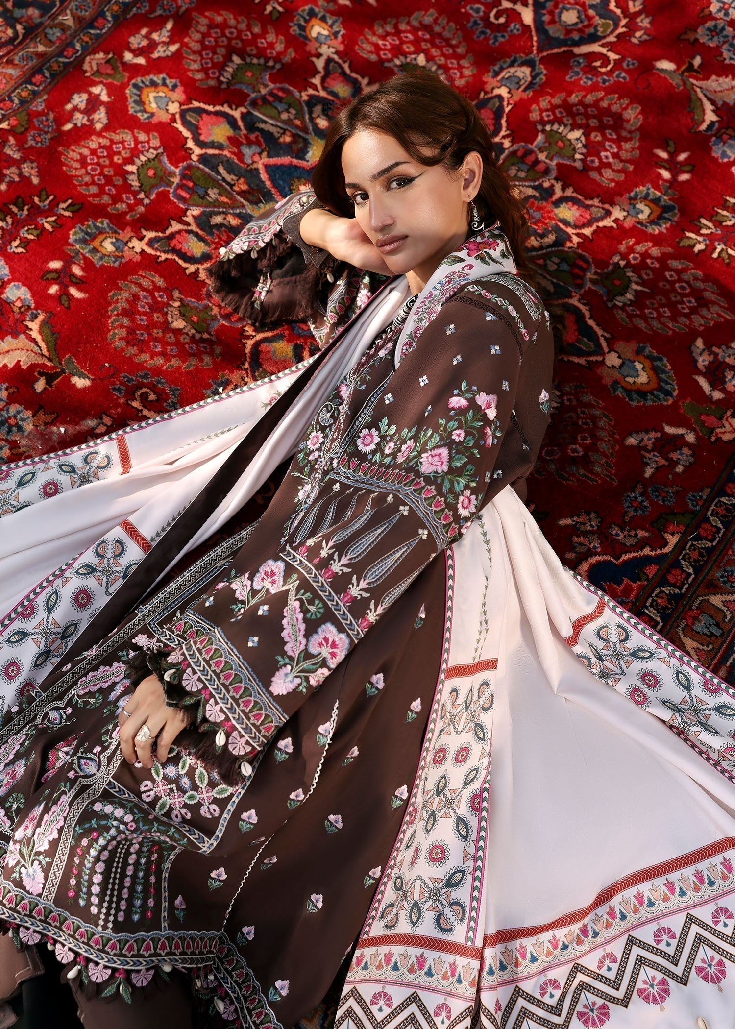 Fabric: A winter story woven in color and craft. Bright threads, confident energy, and a mood made for festive nights. Rendered in decadent chocolate brown khaddar and adorned with intricate pink florals, this ensemble features a statement embroidery layout with a contrasting ivory dupatta. A perfect blend of structure, detailing, and effortless elegance. Details of Fabric: Embroidered Front Central Panel on Khaddar 1 Pcs Embroidered Front Right Panel on Khaddar 1 Pcs Embroidered Front Left Panel on Khaddar 1 Pcs Embroidered Sleeve on Khaddar 0.72 Yard Embroidered Back on Khaddar 1 Yard Printed Shawl on Herringbone 2.7 Yards Dyed Trouser on Khaddar 2.15 Yards |