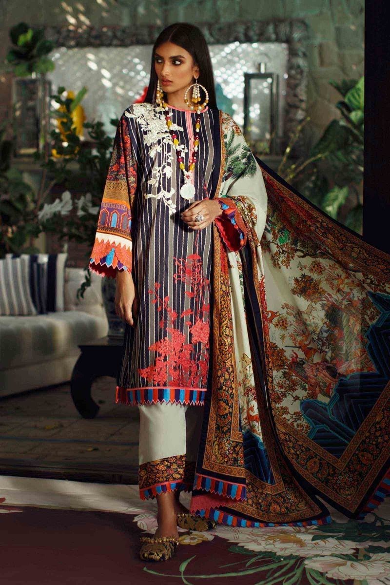 Fabric: A cream, black, ash grey, coral and blue digitally printed Lawn shirt with stripes and Chrysanthemum placements and cream and beige embroidery on organza with Chrysanthemum motifs. Paired with a cream, blue, coral, green and gold digitally printed lawn dupatta featuring motifs derived from Mughal miniature painting. Digitally Printed Lawn Shirt Front 1.15 meters Digitally Printed Lawn Shirt Back 1.15 meters Digitally Printed Lawn Sleeves 0.6 meter Digitally Printed Dupatta on Lawn 2.40 meters Embroidered Patch on Organza |