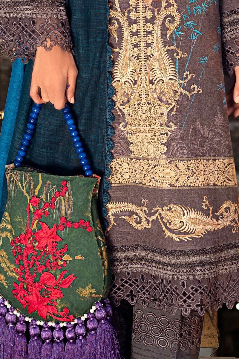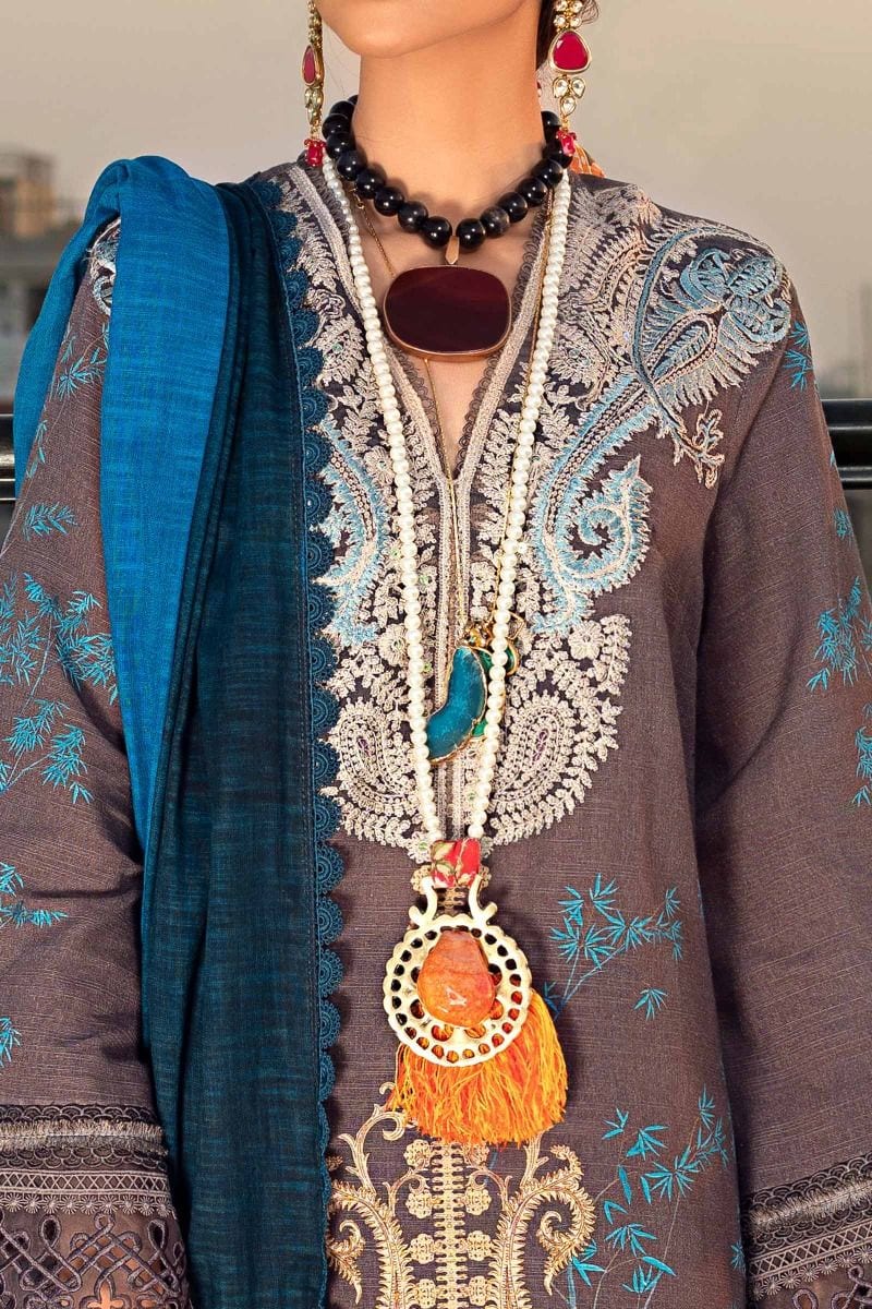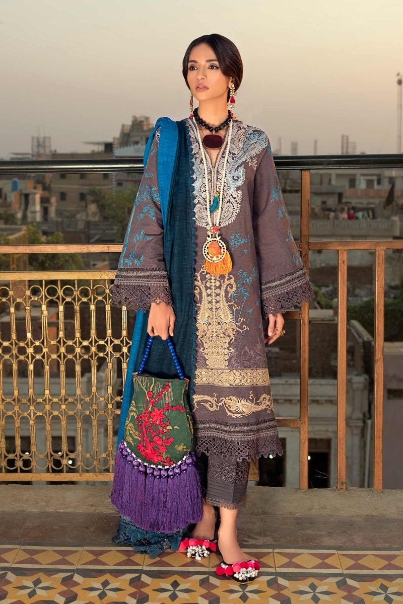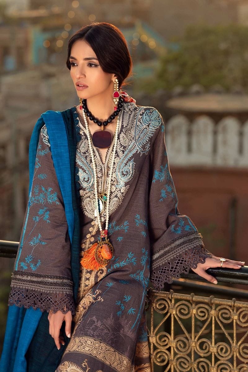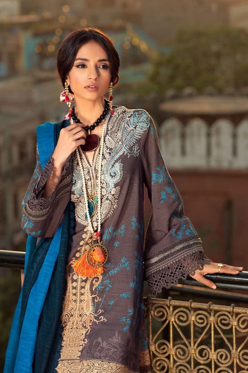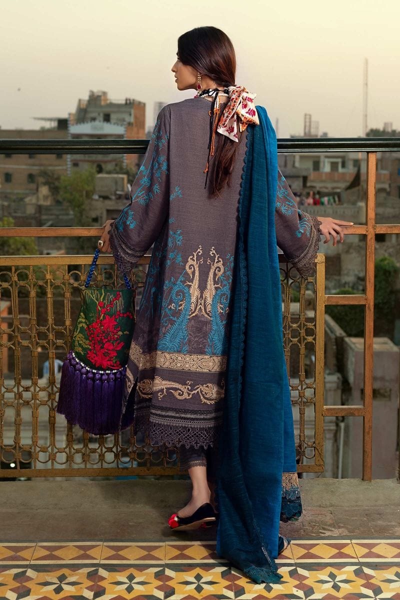 Fabric: A shadow grey, marlin blue, sand and oat slub shirt is layered with a fusion print of Chinese trellis and Kashmiri kashida kari inspired motifs. The sequined neckline rests elegantly onto an oat and marlin blue organza base. Cotton pants in shadow grey complement the khaddar dupatta, dip dyed to perfection in shades of marlin blue. Digitally Printed Shirt Front On Slub 1.20 meters Digitally Printed Shirt Back On Slub 1.20 meters Digitally Printed Sleeves On Slub 0.65 meter Embroidery On Organza Printed Dupatta On Khaddar 2.5 meters Dyed Pants 2.5 meters Disclaimer: The actual product & colors may vary from the images shown depending on the device you are using to view the product. Any additional fabric, patches, or embellishments included with the product are mentioned in the product description. |