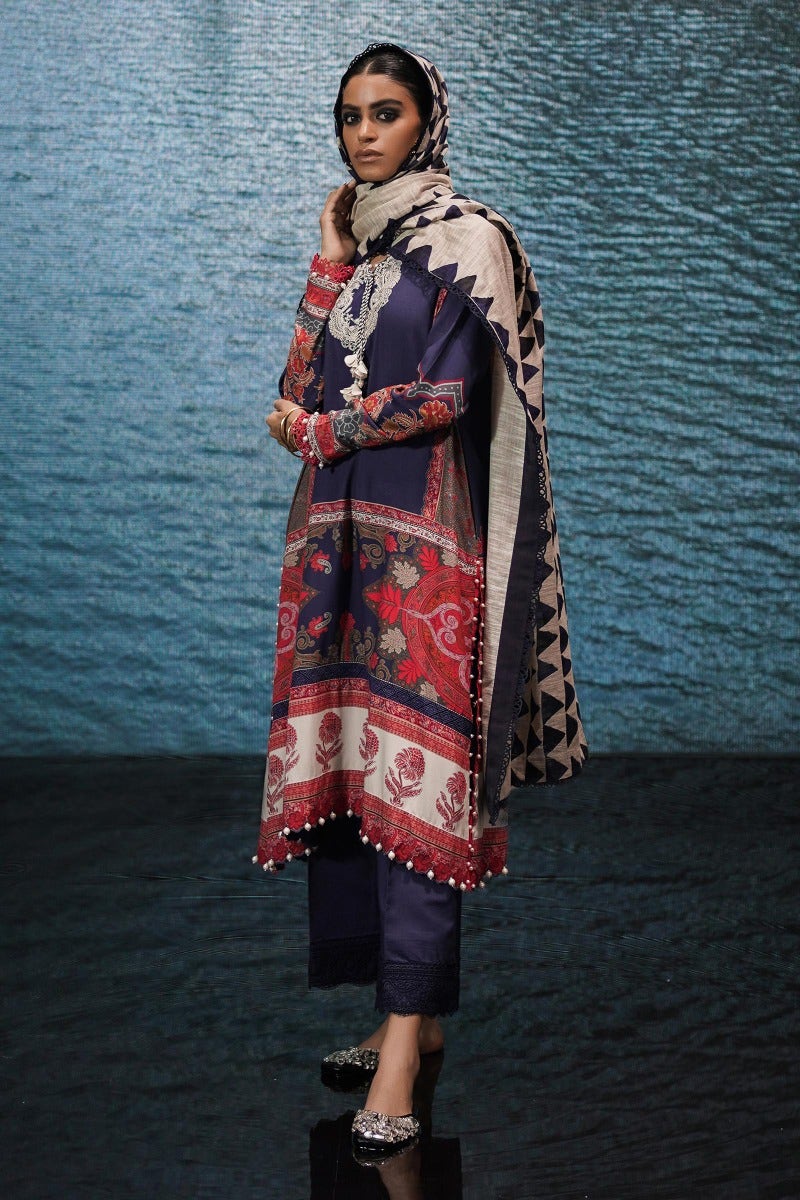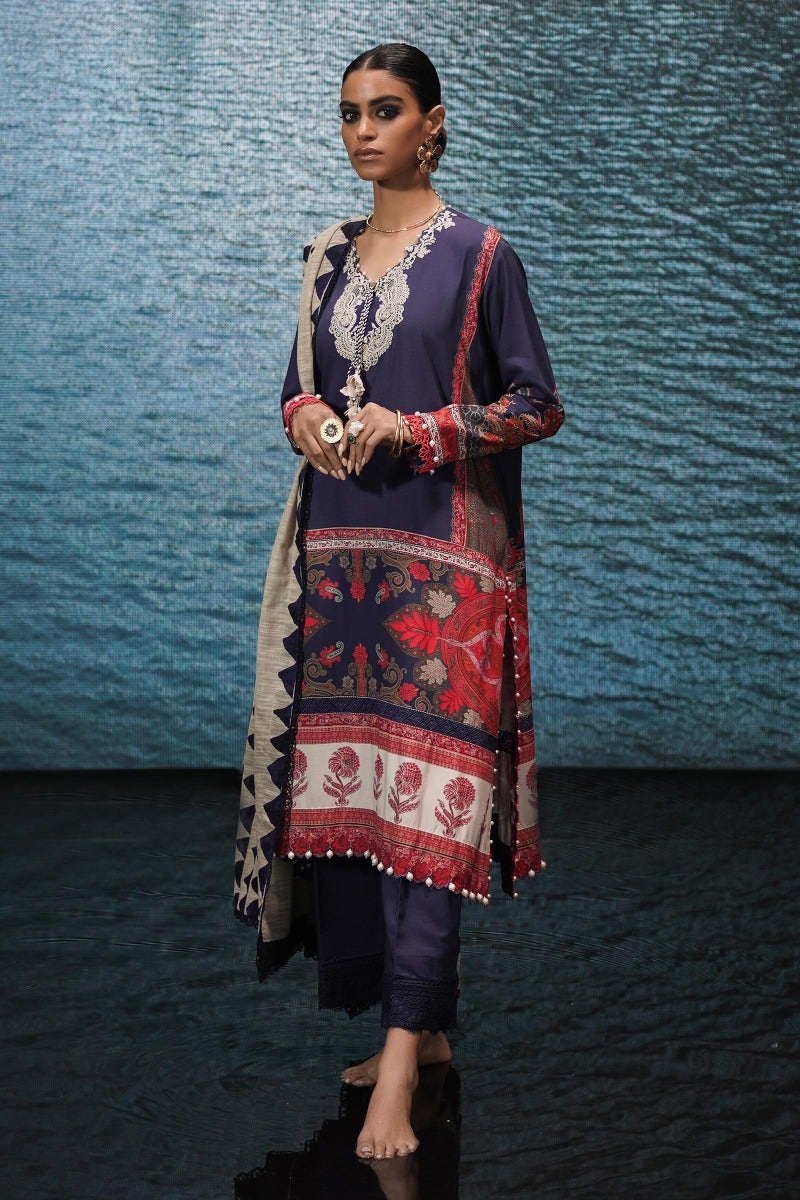 A visually stunning digitally printed shirt on a blue linen canvas with a stunning embroidered neckline in white. Finished off with a matching geometric rotary printed khaddar dupatta and lovely cambric pants.
