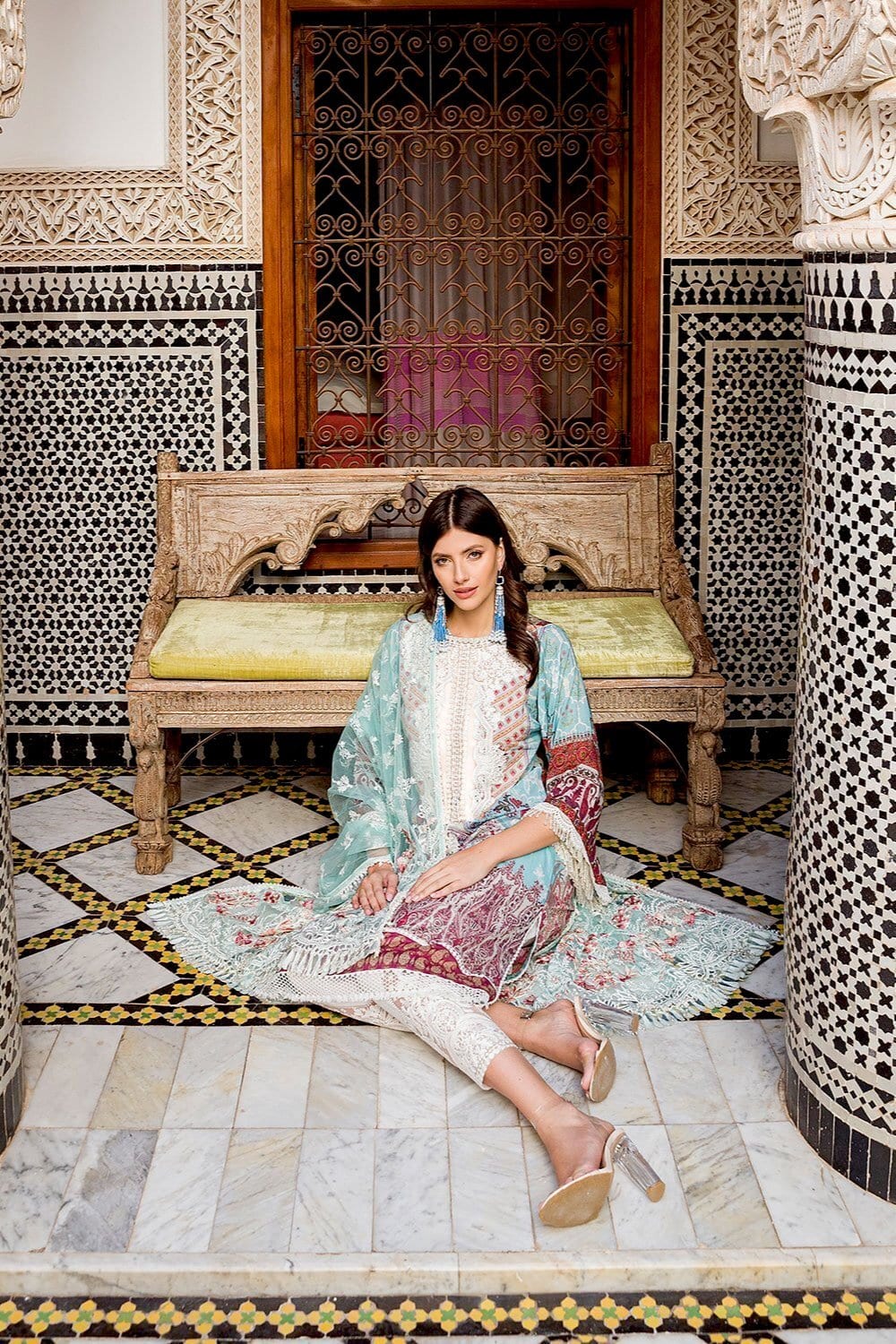 Fabric: Printed front, back and sleeves Embroidered neckline Embroidered trouser patch Plain dyed trouser Embroidered net dupatta (extra laces, hangings and accessories are not included) |