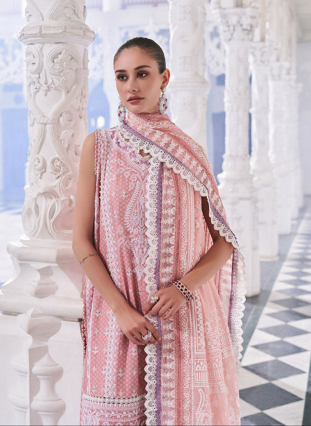 Summary: Embrace the season with this stunning Sobia Nazir Luxury Lawn suit from the Eid Edit collection. The sleeveless kameez features a soft pink hue, beautifully enhanced with white schiffli embroidery and intricate lace borders, offering a chic, breezy look. Made from high-quality lawn fabric, this Pakistani suit is the ultimate choice for keeping cool and stylish during Spring/Summer. The ensemble pairs with a textured sheer dupatta and tailored trousers, making it a perfect pink dress for Eid festivities, garden parties, or day weddings. A blend of modern luxury and traditional charm, this outfit ensures you stand out with elegance. Shop this designer masterpiece online to elevate your festive wardrobe.