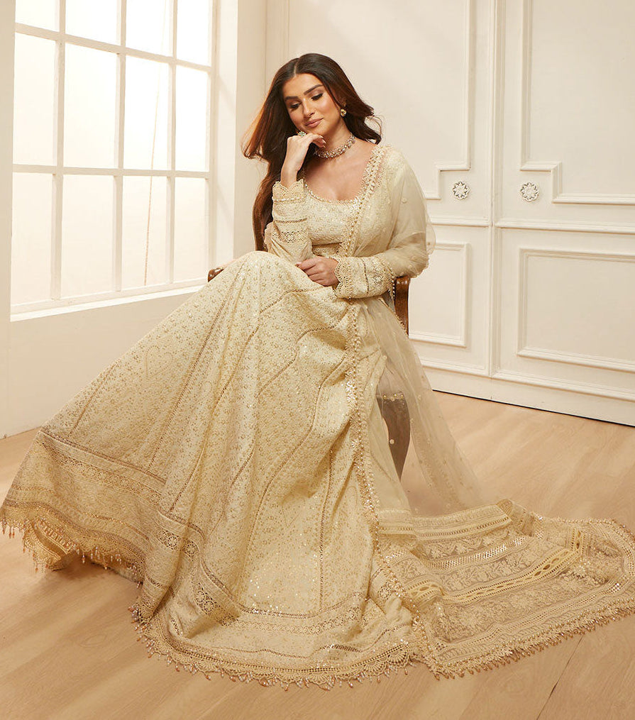 Summary: Radiate sophistication with the Sobia Nazir Luxury Lawn Eid Edit 1A, modeled by the stunning Tara Sutaria. This exquisite Pakistani suit features a floor-length kameez tailored from premium Lawn fabric in a lustrous Cream hue, perfectly suited for the Spring/Summer season. The shirt is heavily embellished with intricate tonal embroidery, offering a luxurious texture that defines high-end ethnic wear. Paired with a sheer, embroidered Net dupatta, this ensemble creates a dreamy silhouette ideal for Eid celebrations, Nikah ceremonies, or elegant day weddings. The soft pastel palette and breathable material ensure comfort without compromising on style, making it a definitive choice for festive occasions. Buy this designer Pakistani dress online to elevate your party wear collection with timeless grace.