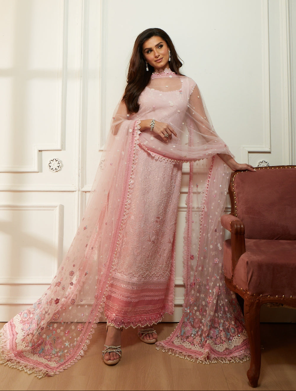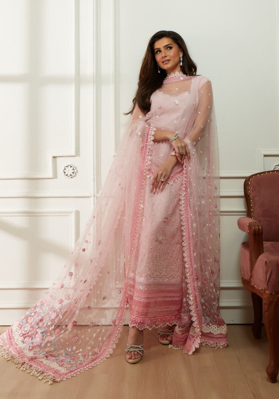 Summary: Radiate elegance in this Pink Pakistani Suit from the Sobia Nazir Luxury Lawn Eid Edit, showcasing the style icon Tara Sutaria. Designed for the Spring/Summer season, the main kameez is crafted from high-quality Lawn fabric, featuring delicate floral embroidery that creates a soft, feminine allure perfect for warm weather. The ensemble is paired with an intricately embellished Net dupatta, adding a layer of sophistication suitable for Eid celebrations, garden parties, or daytime weddings. This Pakistani dress effortlessly merges traditional aesthetics with modern luxury. Perfect for those seeking sophisticated ethnic wear for festive moments. Shop this dreamy pastel outfit online to elevate your seasonal wardrobe.