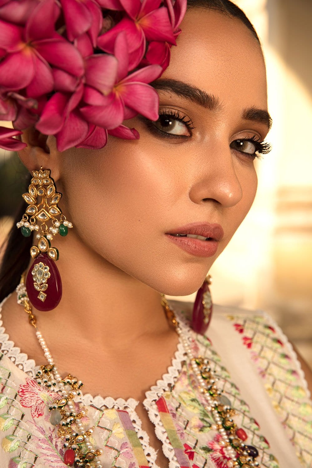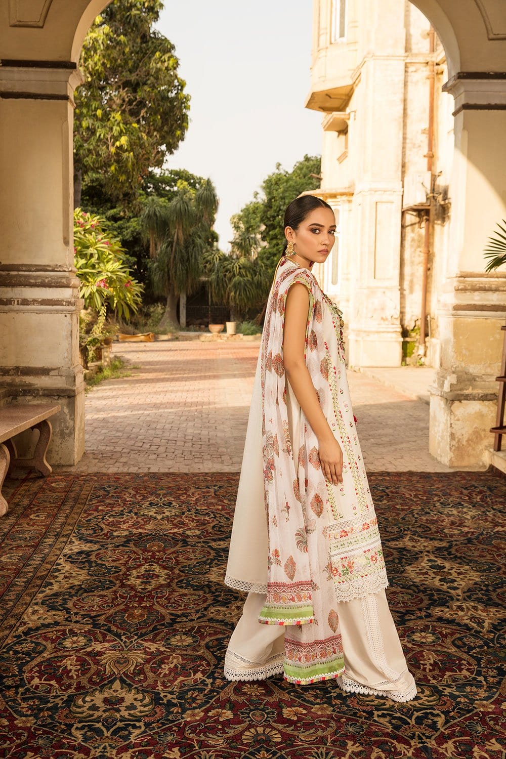 Fabric: Embroidered front panel (Lawn) Embroidered side panels 4 (Lawn) Embroidered borders (Lawn) Plain dyed sleeves (Lawn) Plain dyed back (Lawn) Plain dyed trouser (Lawn) Printed chiffon dupatta (extra laces, hangings and accessories are not included) |