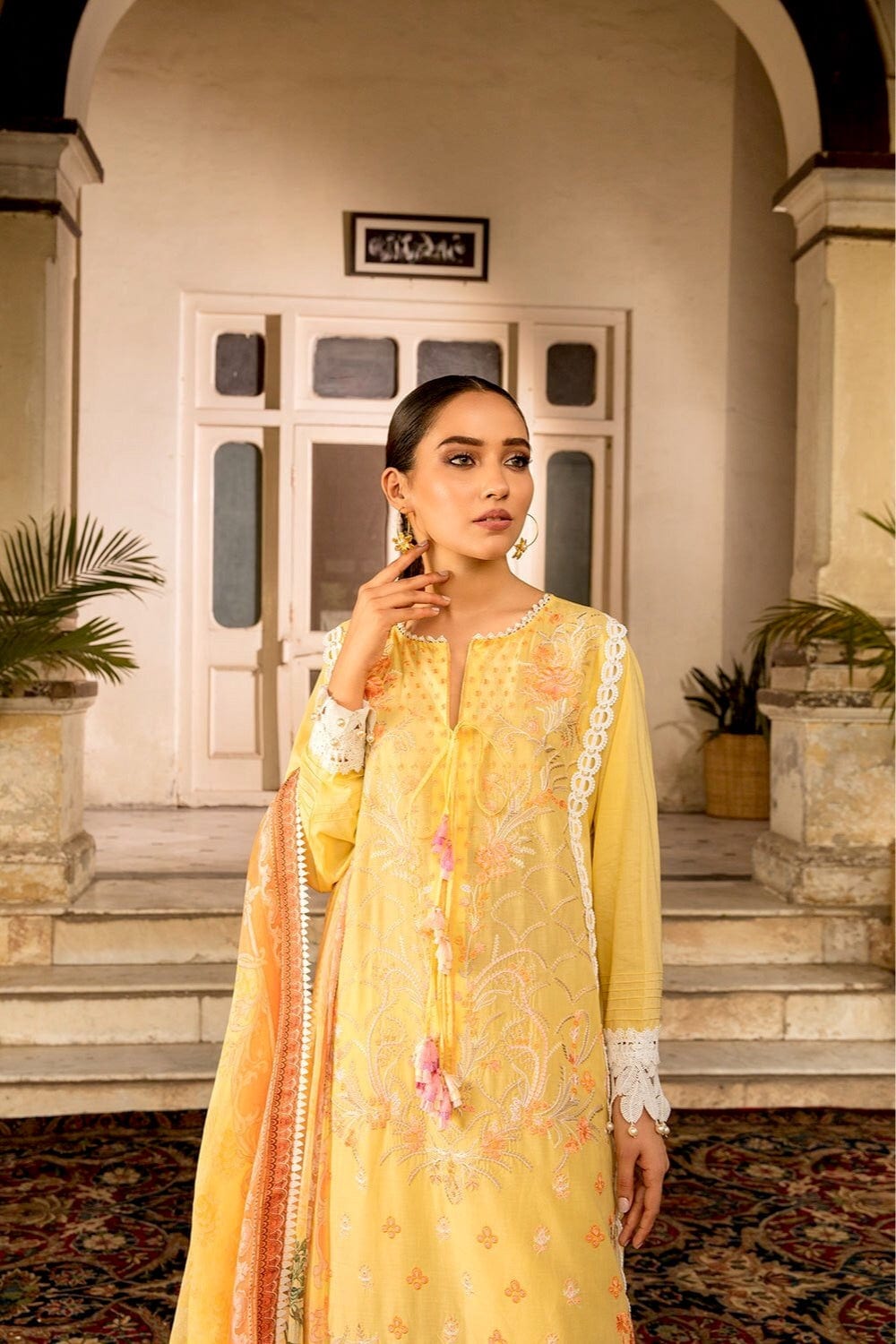 Fabric: Embroidered front (Lawn) Embroidered side panels (Lawn) Embroidered organza border Plain dyed back (Lawn) Plain dyed sleeves (Lawn) Plain dyed trouser (Lawn) Chiffon printed dupatta (extra laces, hangings and accessories are not included) |