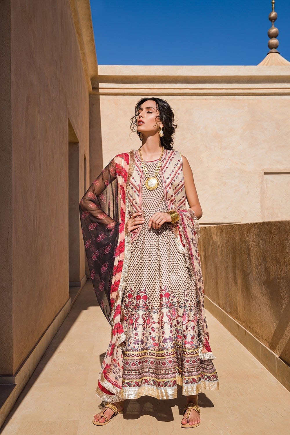Fabric: Printed front and back panels Printed sleeves Embroidered patti Printed chiffon dupatta Plain dyed trouser (extra laces and accessories are not included) |