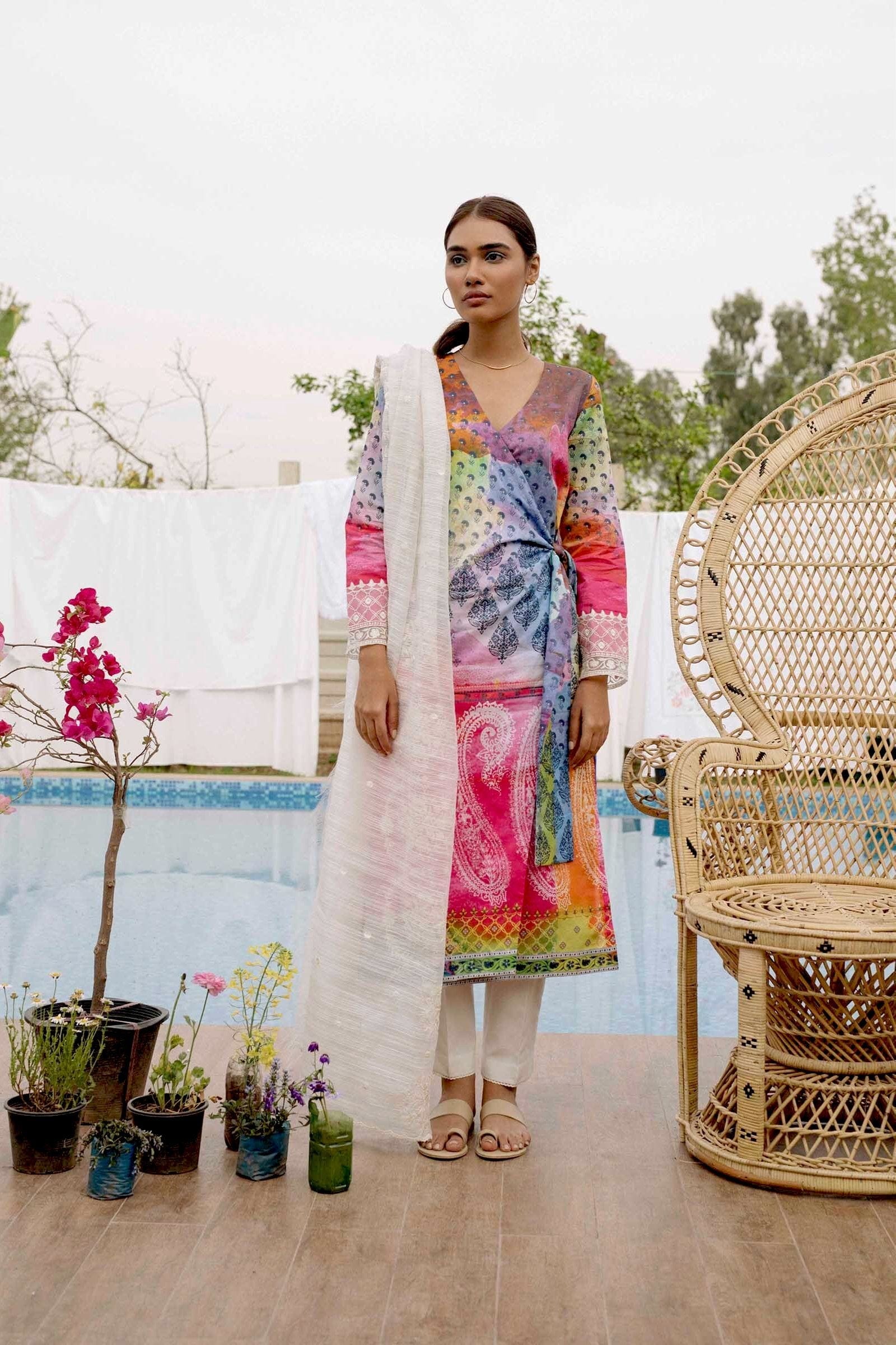 paired with an embroidered net dupatta and an additional sleeve patch. Pure lawn trouser