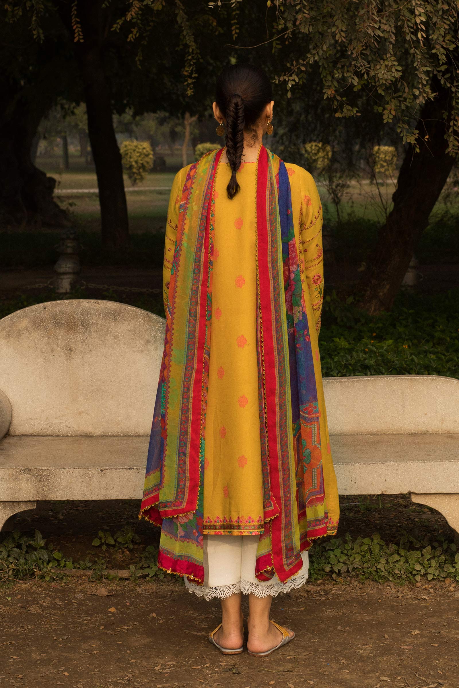 Fabric: Jacquard Front and Back 2 Yards Embroidered Dyed Sleeves 0.65 Yards Embroidered Neckline Patch Embroidered Border for Front and Back 1.6 Yards \nEmbroidered Patti for Panels 5 Yards Printed Border for Finishing 1 Yard Printed Chiffon Dupatta 2.6 Yards Printed cambric trouser 2.15 Yards |