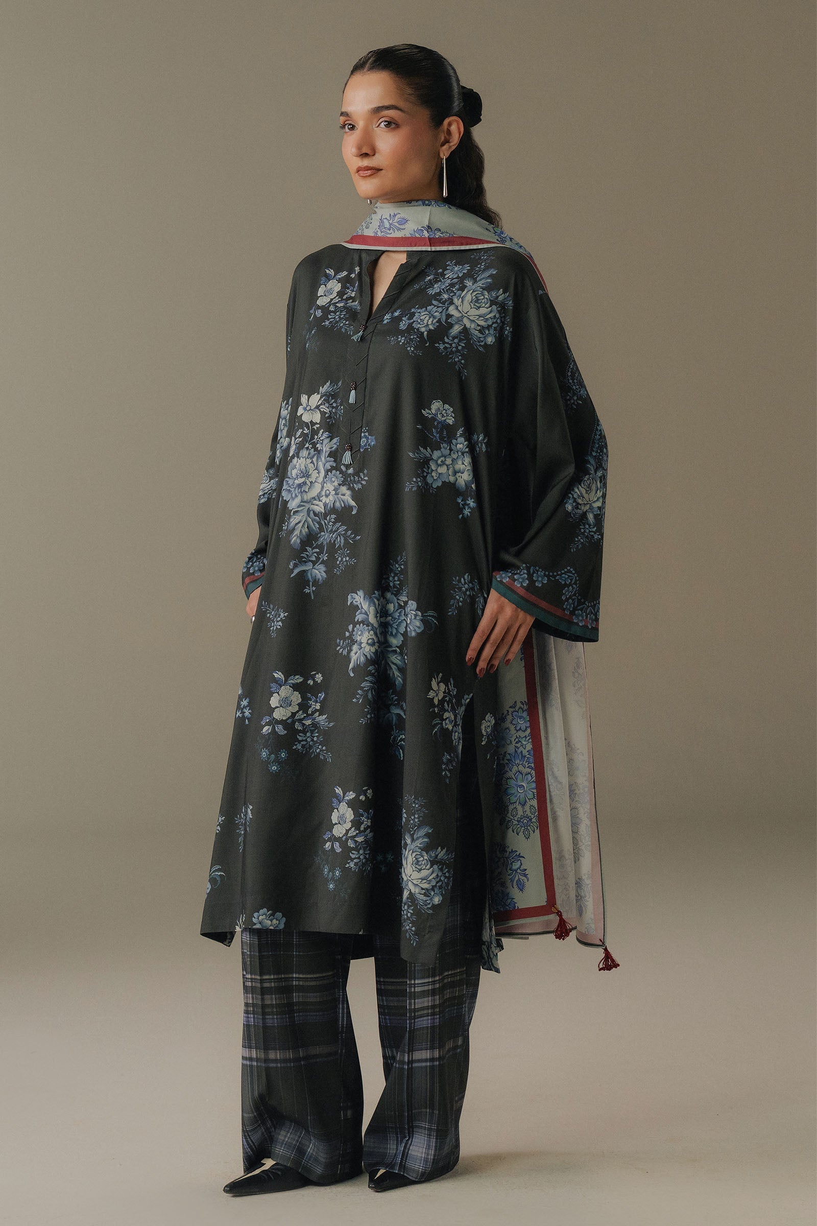 Summary: Embrace sophisticated winter fashion with this Zara Shahjahan Pakistani suit. The ensemble is centered around a gorgeous linen shirt in a deep charcoal grey, providing a canvas for exquisite floral prints inspired by Japanese pottery. The breathable yet warm linen fabric makes this ethnic wear ideal for the Fall/Winter season. The elegant design exudes a refined charm perfect for formal dinners and evening gatherings. This unstitched suit offers a blend of artistic inspiration and contemporary style, making it a standout piece for your formal wardrobe.