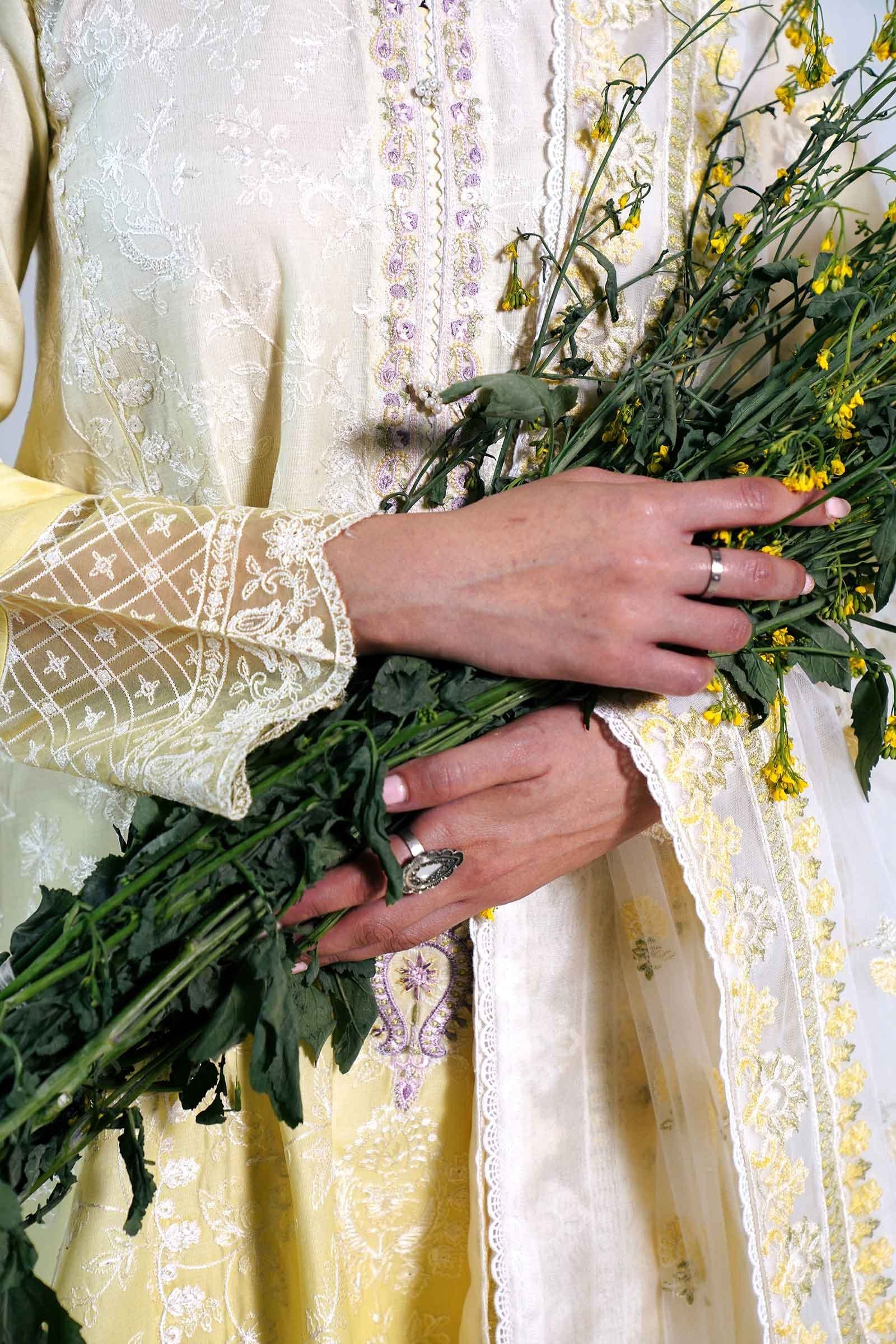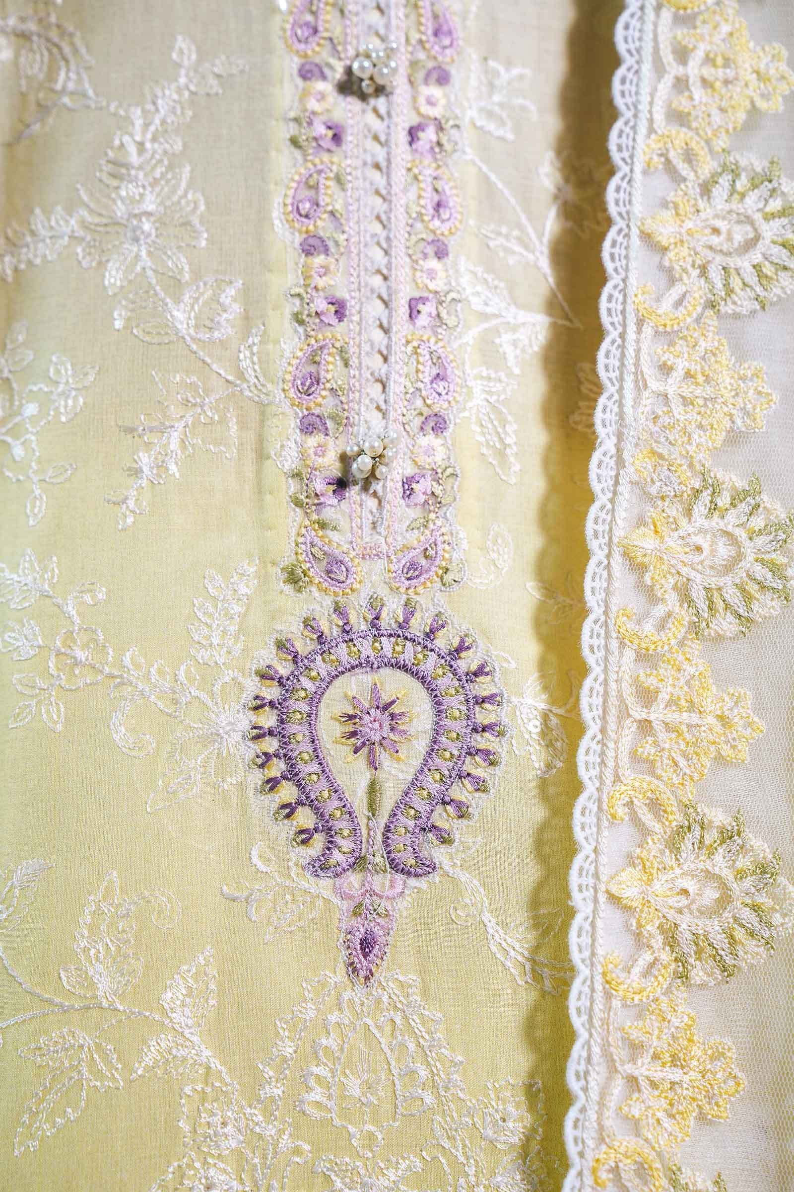 Fabric:Embroidered & Printed Shirt Front with Back 2 Yards Embroidered & Printed Sleeves 0.65 Yard Embroidered Neckline Embroidered Sleeve Border Patch 0.8 Yard Embroidered Patti 1.65 Yards Embroidered Motifs for Dupatta 4 Pieces Embroidered Net Dupatta 2.8 Yard Plain Cambric Trouser 2 Meters |
